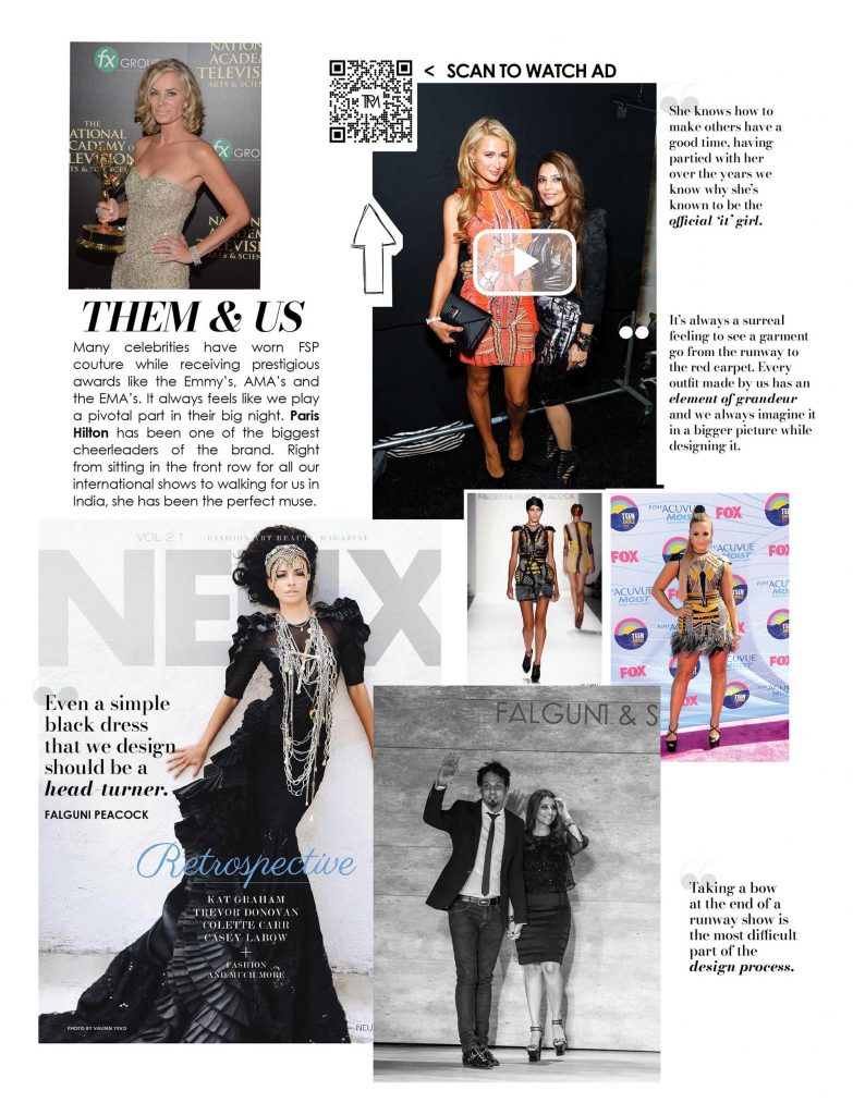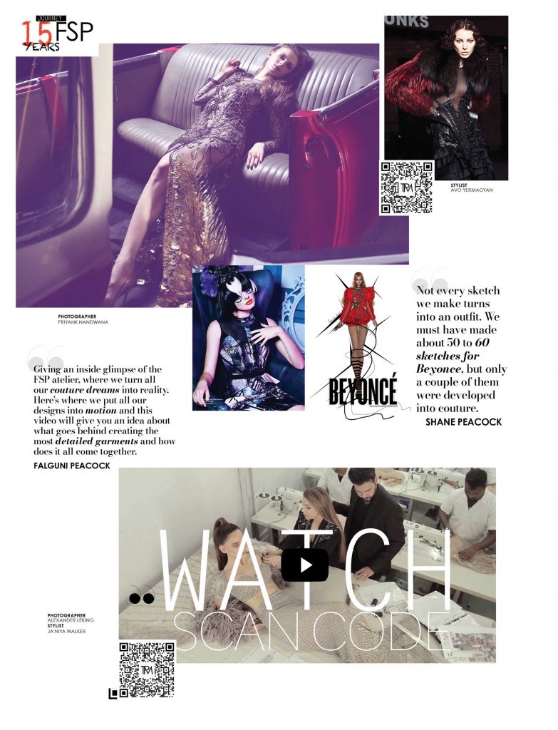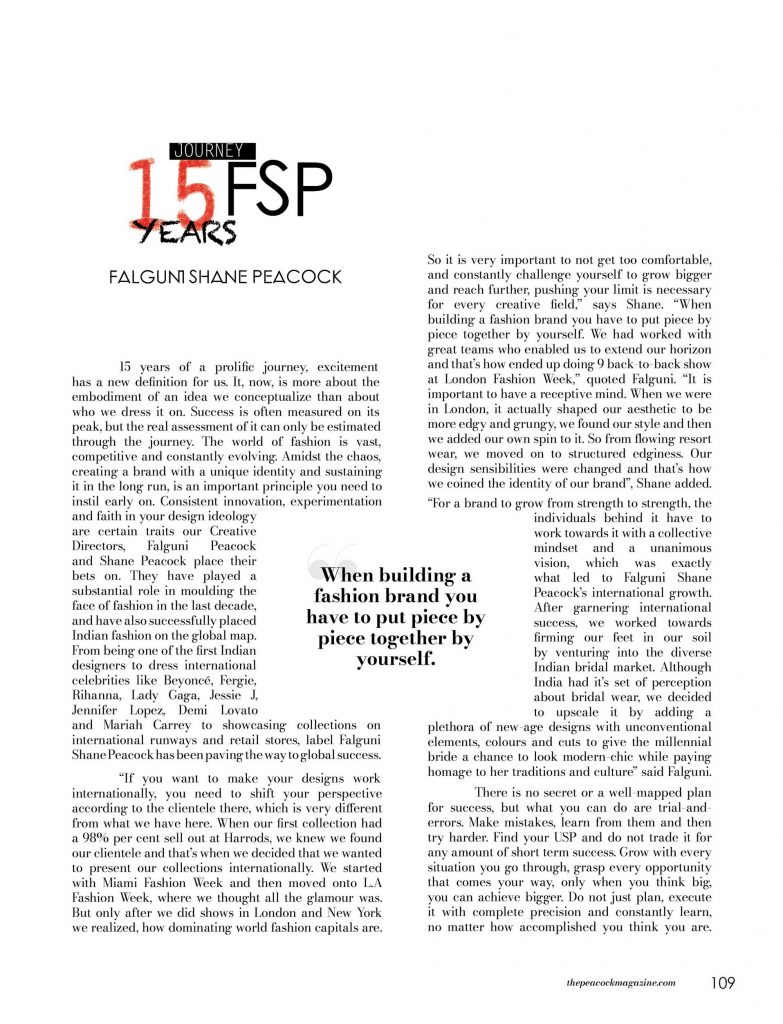 15 years of a prolifc journey, excitement has a new defnition for us. It, now, is more about the embodiment of an idea we conceptualize than about who we dress it on. Success is often measured on its peak, but the real assessment of it can only be estimated through the journey. The world of fashion is vast, competitive and constantly evolving. Amidst the chaos, creating a brand with a unique identity and sustaining it in the long run, is an important principle you need to instil early on. Consistent innovation, experimentation and faith in your design ideology are certain traits our Creative Directors, Falguni Peacock and Shane Peacock place their bets on. They have played a substantial role in moulding the face of fashion in the last decade, and have also successfully placed Indian fashion on the global map. From being one of the frst Indian designers to dress international celebrities like Beyoncé, Fergie, Rihanna, Lady Gaga, Jessie J, Jennifer Lopez, Demi Lovato and Mariah Carrey to showcasing collections on international runways and retail stores, label Falguni Shane Peacock has been paving the way to global success. “If you want to make your designs work internationally, you need to shift your perspective according to the clientele there, which is very different from what we have here. When our frst collection had a 98% per cent sell out at Harrods, we knew we found our clientele and that’s when we decided that we wanted to present our collections internationally. We started with Miami Fashion Week and then moved onto L.A Fashion Week, where we thought all the glamour was. But only after we did shows in London and New York we realized, how dominating world fashion capitals are.So it is very important to not get too comfortable, and constantly challenge yourself to grow bigger and reach further, pushing your limit is necessary for every creative feld,” says Shane.