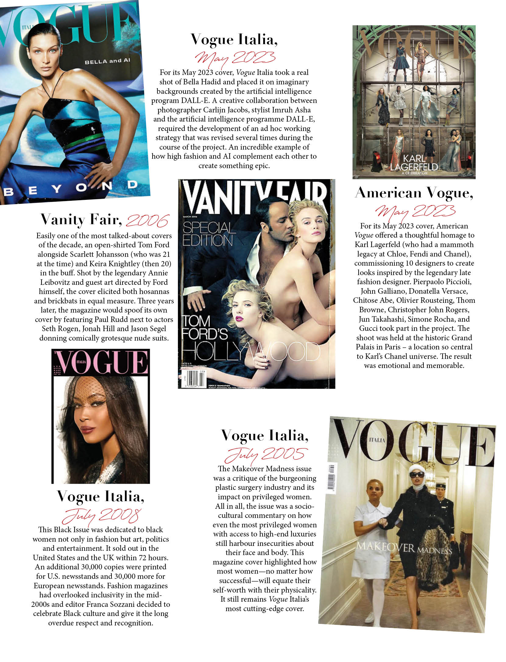 The Makeover Madness issue was a critique of the burgeoning plastic surgery industry and its impact on privileged women. All in all, the issue was a socio-cultural commentary on how even the most privileged women with access to high-end luxuries still harbour insecurities about their face and body. This magazine cover highlighted how most women—no matter how successful—will equate their self-worth with their physicality. It still remains Vogue Italia’s most cutting-edge cover.