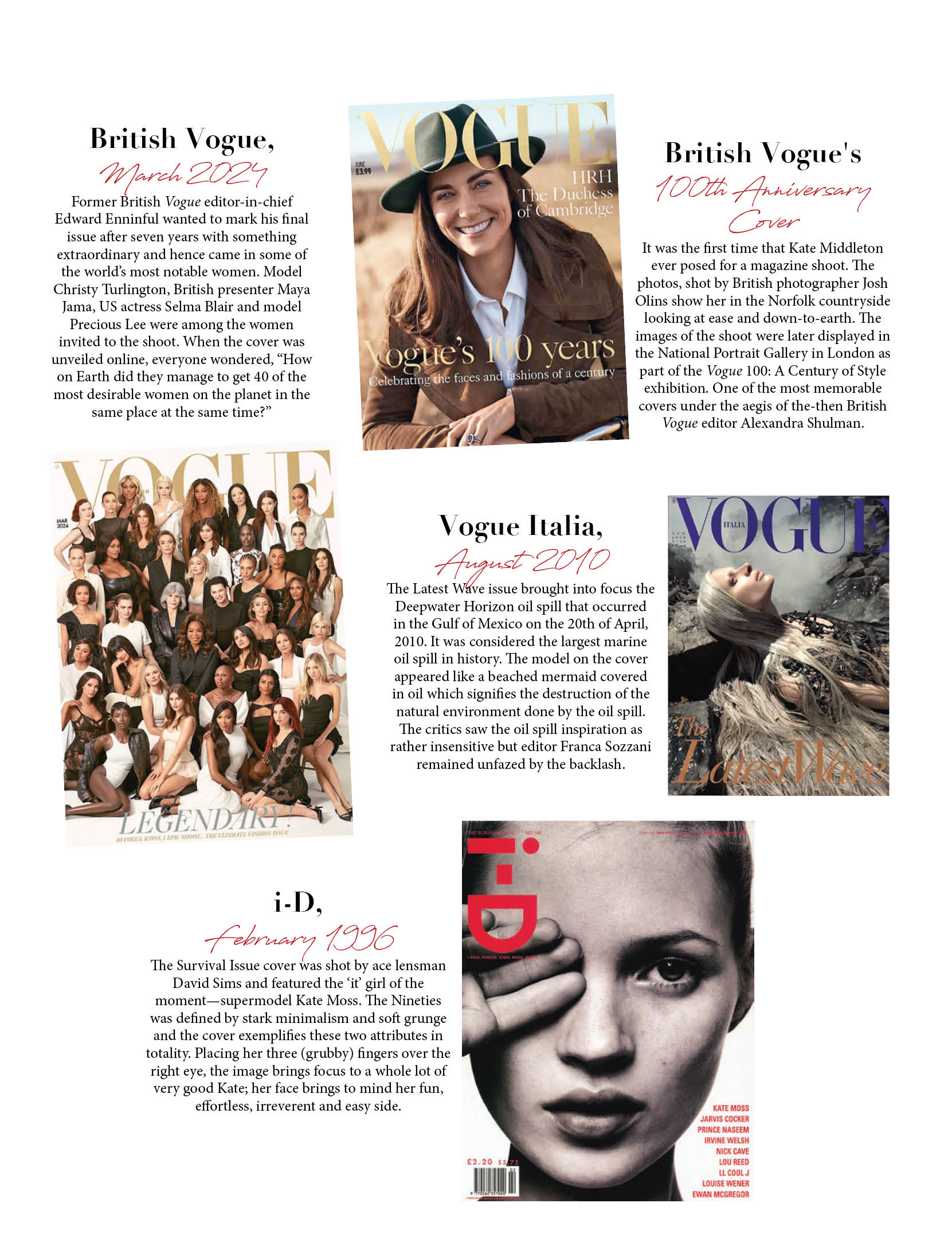 The Latest Wave issue brought into focus the Deepwater Horizon oil spill that occurred in the Gulf of Mexico on the 20th of April, 2010. It was considered the largest marine oil spill in history. The model on the cover appeared like a beached mermaid covered in oil which signifies the destruction of the natural environment done by the oil spill. The critics saw the oil spill inspiration as rather insensitive but editor Franca Sozzani remained unfazed by the backlash.