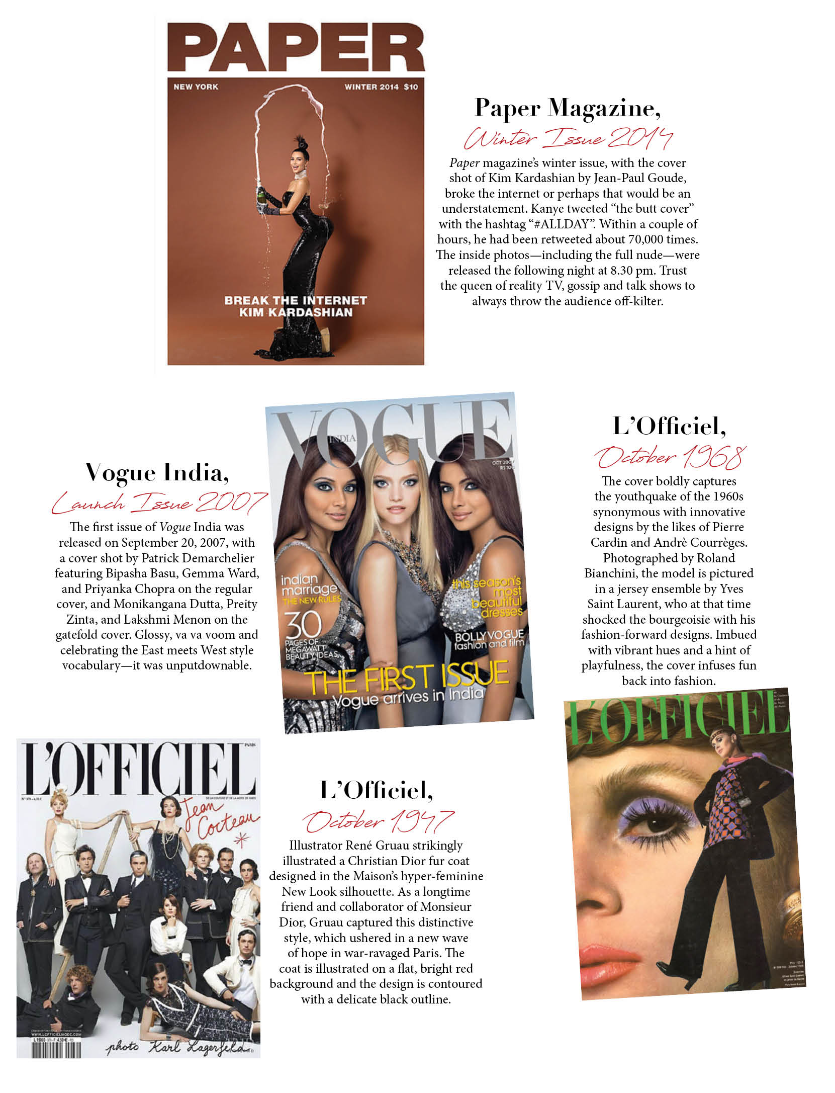 The first issue of Vogue India was released on September 20, 2007, with a cover shot by Patrick Demarchelier featuring Bipasha Basu, Gemma Ward, and Priyanka Chopra on the regular cover, and Monikangana Dutta, Preity Zinta, and Lakshmi Menon on the gatefold cover. Glossy, va va voom and celebrating the East meets West style vocabulary—it was unputdownable.