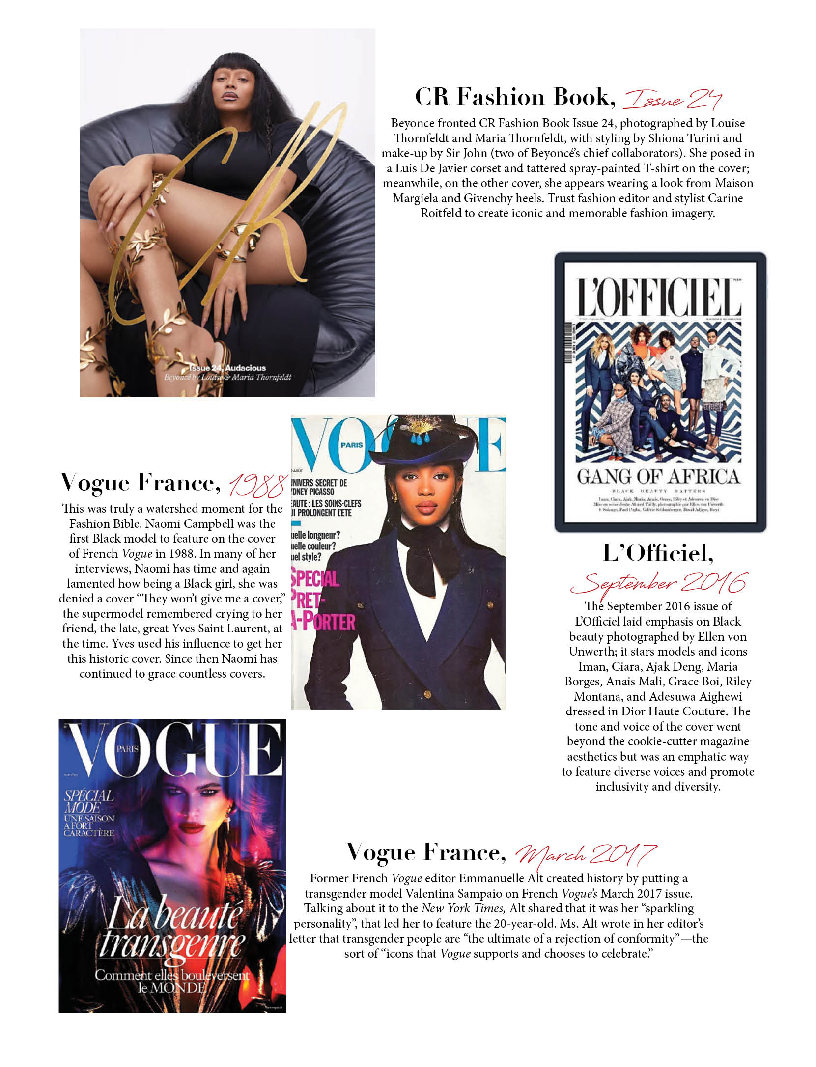 The September 2016 issue of L’Officiel laid emphasis on Black beauty photographed by Ellen von Unwerth; it stars models and icons Iman, Ciara, Ajak Deng, Maria Borges, Anais Mali, Grace Boi, Riley Montana, and Adesuwa Aighewi dressed in Dior Haute Couture. The tone and voice of the cover went beyond the cookie-cutter magazine aesthetics but was an emphatic way to feature diverse voices and promote inclusivity and diversity.