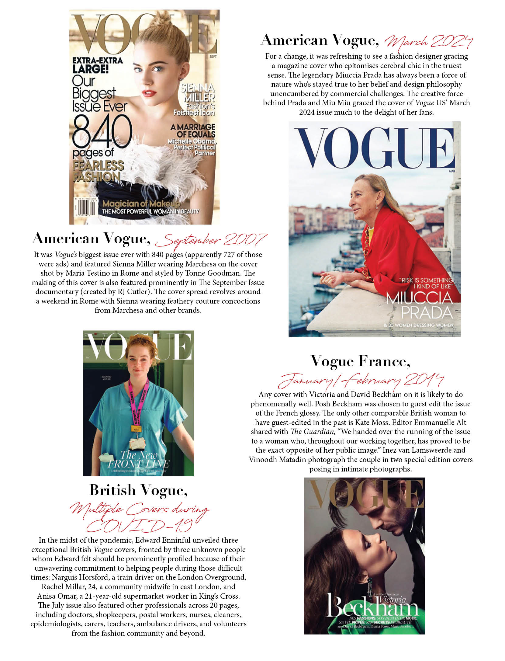 In the midst of the pandemic, Edward Enninful unveiled three exceptional British Vogue covers, fronted by three unknown people whom Edward felt should be prominently profiled because of their unwavering commitment to helping people during those difficult times: Narguis Horsford, a train driver on the London Overground, Rachel Millar, 24, a community midwife in east London, and Anisa Omar, a 21-year-old supermarket worker in King’s Cross. The July issue also featured other professionals across 20 pages, including doctors, shopkeepers, postal workers, nurses, cleaners, epidemiologists, carers, teachers, ambulance drivers, and volunteers from the fashion community and beyond.