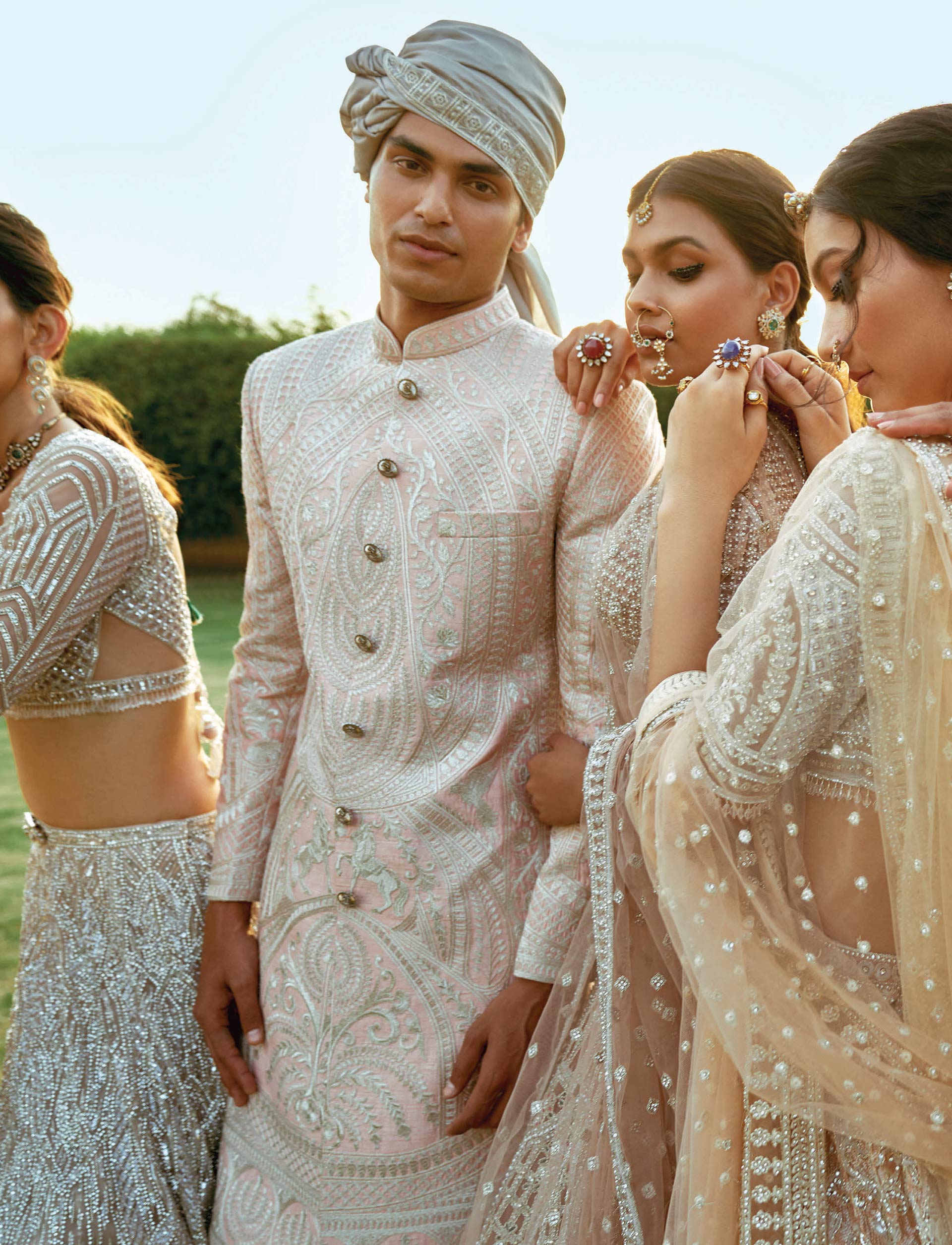 Borrowing from the beauty of Taj Mahal, the outfits transcribe the innumerable motifs of the architectural gem on ensembles to varnishing them with refined adornments of Swarovski crystals, pearls, mirrors, sequins and beads. The collection is a medley of colours that scale from mellow muted tones such as baked beige and pearl ivory, to pastels like rose pink. A splash to metallic hues viz. silvers and gold as jewellery elevate the grandeur while adding a dash of glamour. The intricate crafting techniques replicated the structural marvel on the fabric via architectural motifs of domes and minarets, filigree of foliage, and motifs of the century’s fauna and birds. The cuts are traditional yet au courant, think trailed Lehenga, fitted-and-flared silhouettes, and ball gown-style Lehengas that make for a befitting wedding day bridal trousseau.