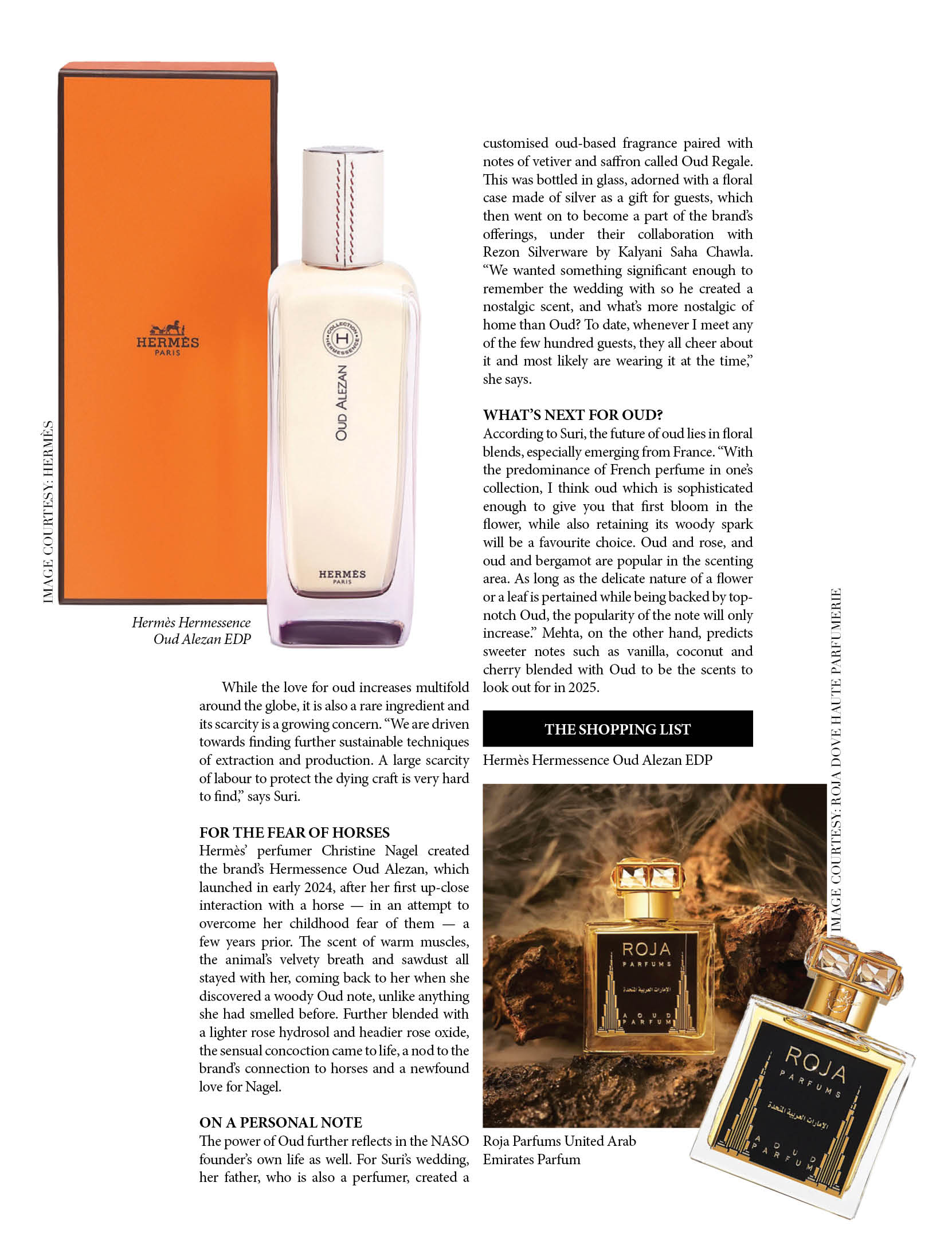 Hermès’ perfumer Christine Nagel created the brand’s Hermessence Oud Alezan, which launched in early 2024, after her first up-close interaction with a horse — in an attempt to overcome her childhood fear of them — a few years prior. The scent of warm muscles, the animal’s velvety breath and sawdust all stayed with her, coming back to her when she discovered a woody Oud note, unlike anything she had smelled before. Further blended with a lighter rose hydrosol and headier rose oxide, the sensual concoction came to life, a nod to the brand’s connection to horses and a newfound love for Nagel.