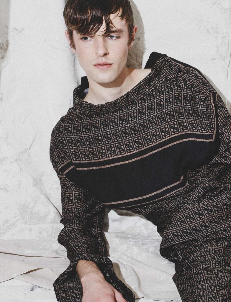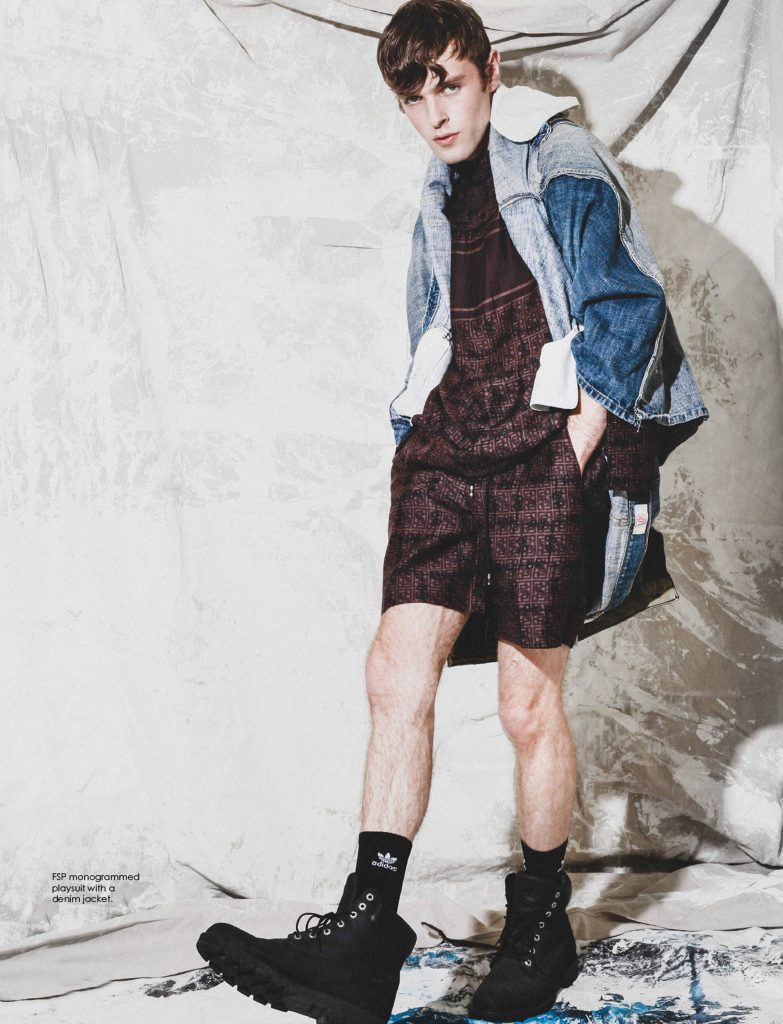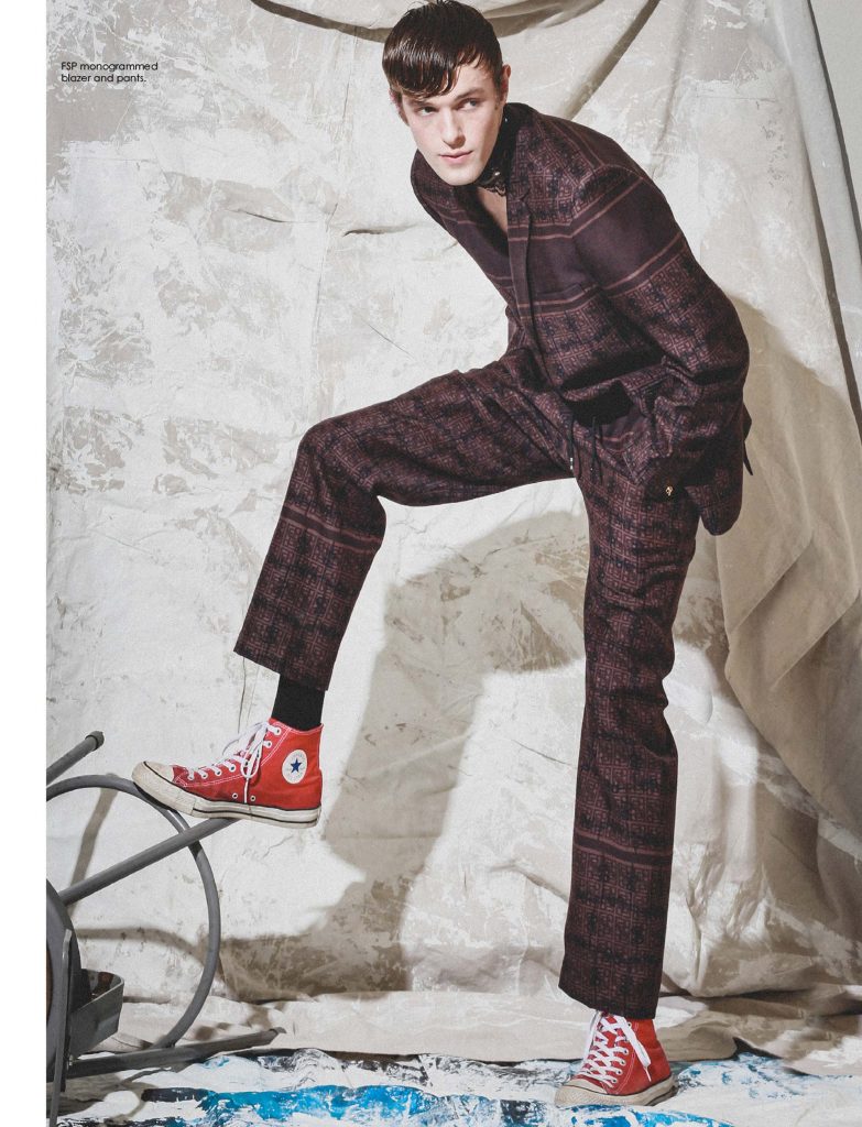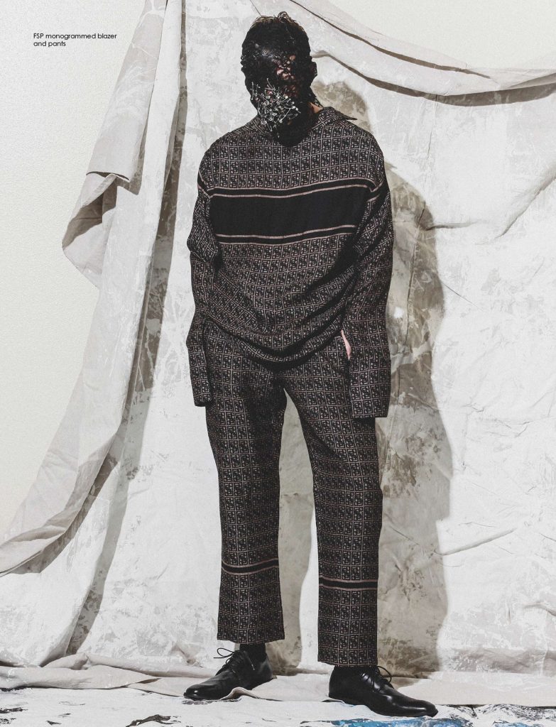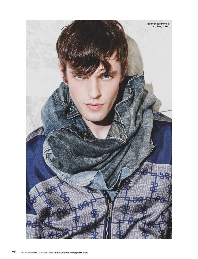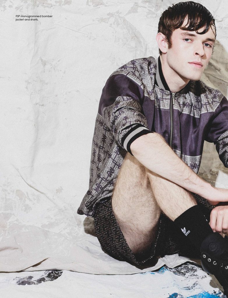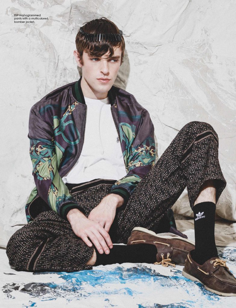 FSP monogrammed pants with a multicolored, bomber jacket.