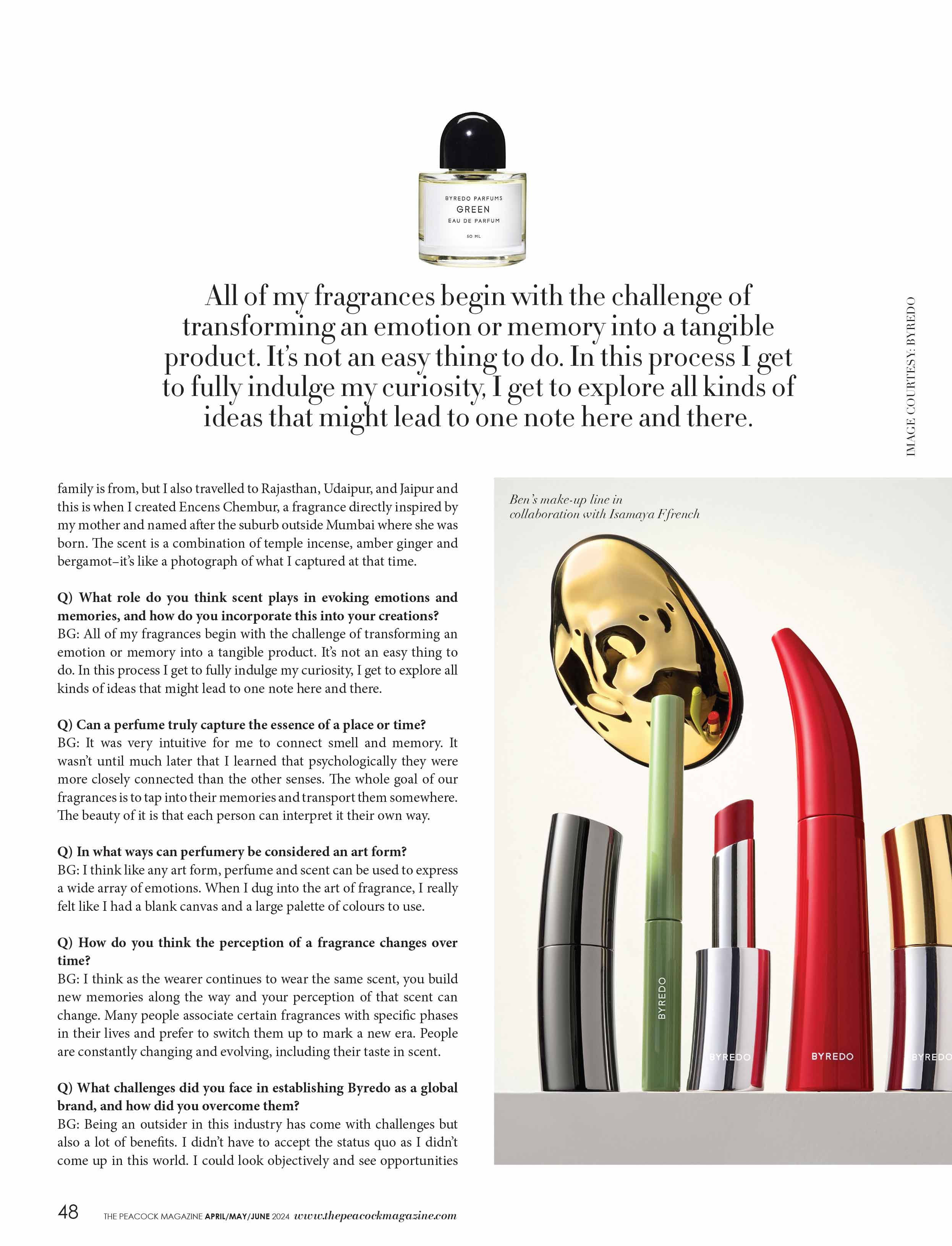 Ben Gorham (BG): I feel very connected to my heritage. Being biracial has meant I struggled somewhat with my own identity while growing up but it also gave me a great appreciation for culture and its differences. I would say Byredo taps into that curiosity and adaptive nature. Culture is a great source of inspiration and as I learn more the brand evolves. That’s how I always imagined it. My childhood trips to India have definitely influenced my appreciation for diverse smells.