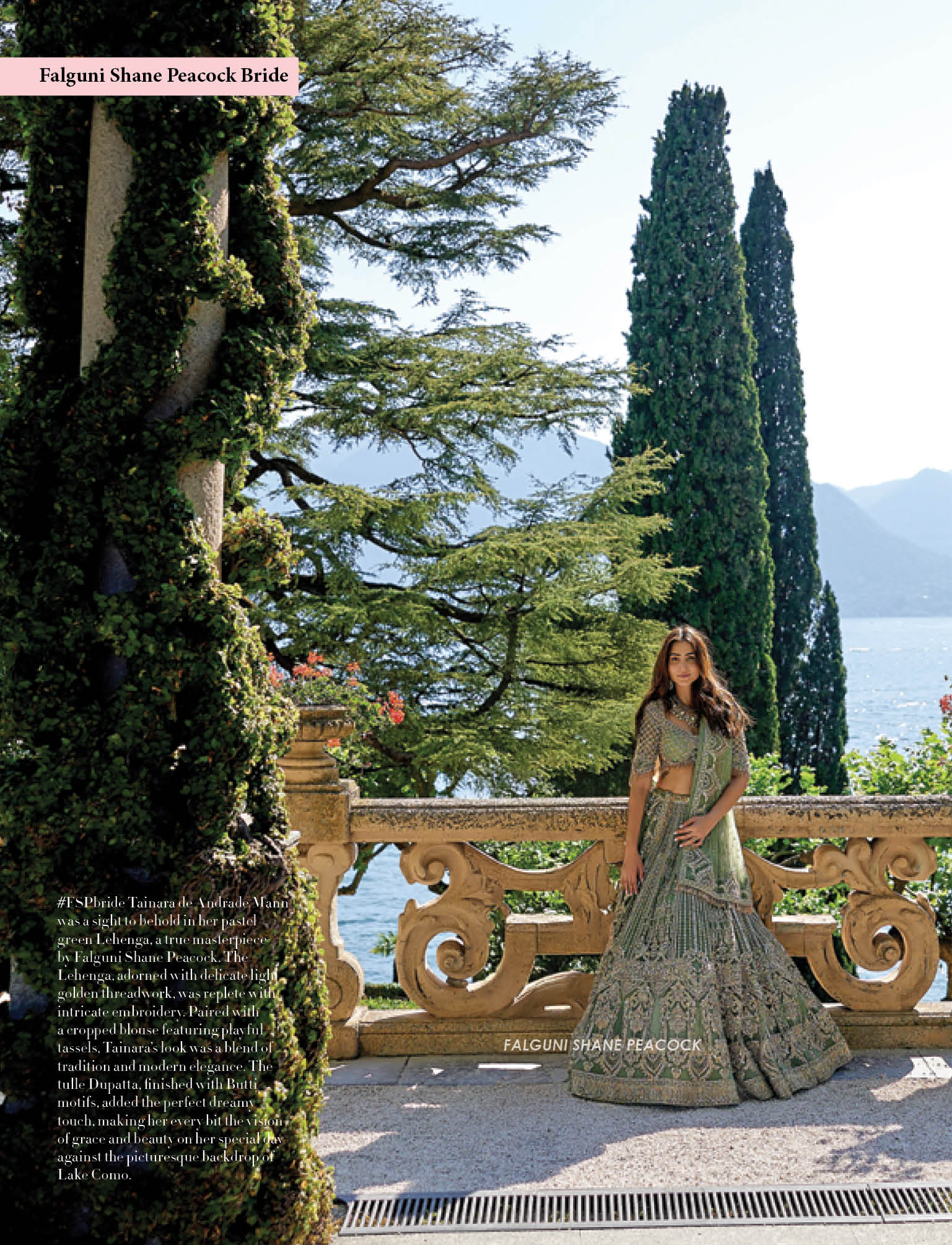 #FSPbride Tainara de Andrade Mann was a sight to behold in her pastel green Lehenga, a true masterpiece by Falguni Shane Peacock. The Lehenga, adorned with delicate light golden threadwork, was replete with intricate embroidery. Paired with a cropped blouse featuring playful tassels, Tainara’s look was a blend of tradition and modern elegance. The tulle Dupatta, finished with Butti motifs, added the perfect dreamy touch, making her every bit the vision of grace and beauty on her special day against the picturesque backdrop of Lake Como.