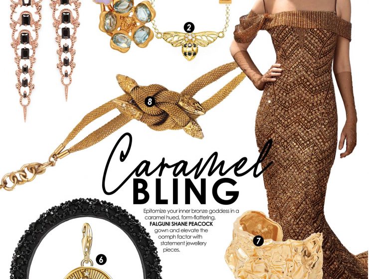 CARAMEL BLING- Epitomize your inner bronze goddess in a caramel hued, form-flattering, FALGUNI SHANE PEACOCK…