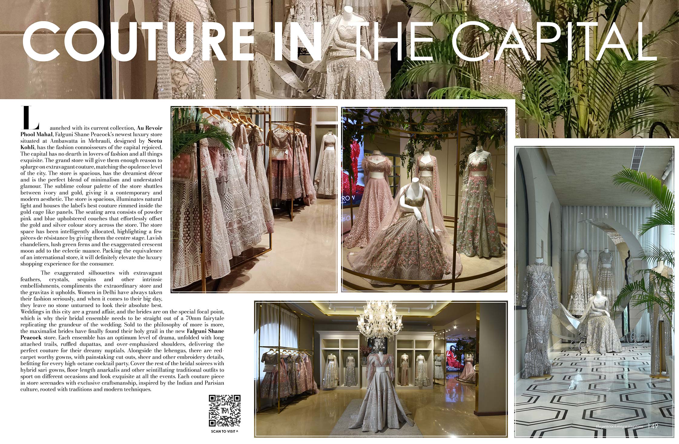 Launched with its current collection, Au Revoir Phool Mahal, Falguni Shane Peacock’s newest luxury store situated Ambawatta, Mehrauli, has the fashion connoisseurs of the city rejoiced. The capital has no dearth in lovers of fashion and all things exquisite, the grand store will give them enough reason to splurge on extravagant couture, matching the opulence level of the city. The store is spacious and has the dreamiest décor; it is the perfect blend of minimalism and understated glamour. The sublime colour palette of the store shuttles between ivory and gold, giving it a contemporary and modern aesthetic. The store is spacious, illuminates natural light and houses the label’s best couture rimmed inside the gold cage like panels. The seating area consists of powder pink and blue upholstered couches that effortlessly offset the gold and silver colour story across the store. The store space has been intelligently allocated, highlighting a few pièces de résistance by giving them the centre stage. Lavish chandeliers, lush green ferns and the exaggerated crescent moon add to the eclectic nuance. Packing the equivalence of an international store, it will definitely elevate the luxury shopping experience for the consumer.