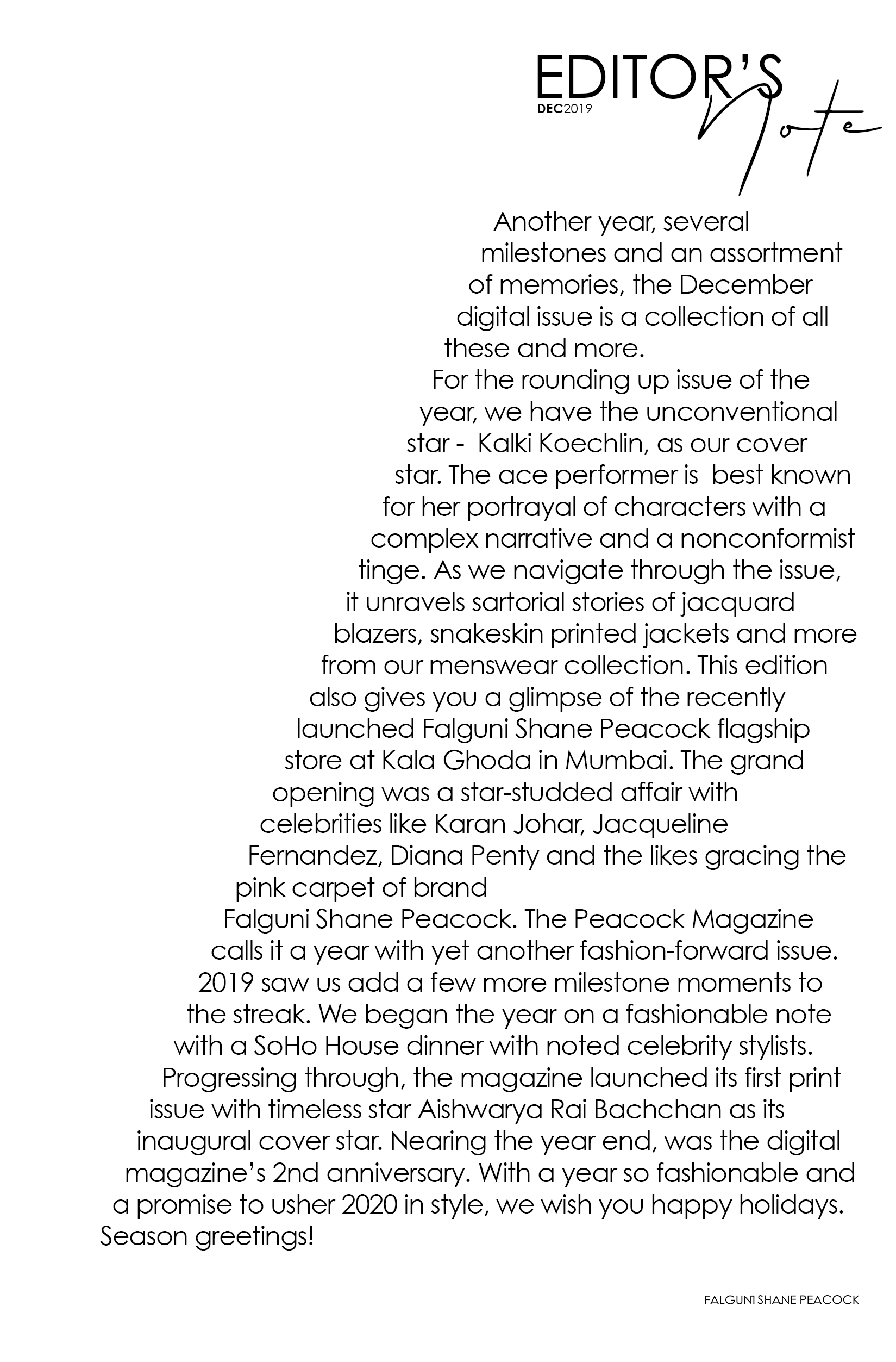 Another year, several milestones and an assortment of memories, the December digital issue is a collection of all these and more. For the rounding up issue of the year, we have the unconventional star – Kalki Koechlin, as our cover star. The ace performer is best known for her portrayal of characters with a complex narrative and a nonconformist tinge. As we navigate through the issue, it unravels sartorial stories of jacquard blazers, snakeskin printed jackets and more from our menswear collection. This edition also gives you a glimpse of the recently launched Falguni Shane Peacock flagship store at Kala Ghoda in Mumbai. The grand opening was a star-studded affair with celebrities like Karan Johar, Jacqueline Fernandez, Diana Penty and the likes gracing the pink carpet of brand Falguni Shane Peacock. The Peacock Magazine calls it a year with yet another fashion-forward issue. 2019 saw us add a few more milestone moments to the streak. We began the year on a fashionable note with a SoHo House dinner with noted celebrity stylists. Progressing through, the magazine launched its first print issue with timeless star Aishwarya Rai Bachchan as its inaugural cover star. Nearing the year end, was the digital magazine’s 2nd anniversary. With a year so fashionable and a promise to usher 2020 in style, we wish you happy holidays. Season greetings!