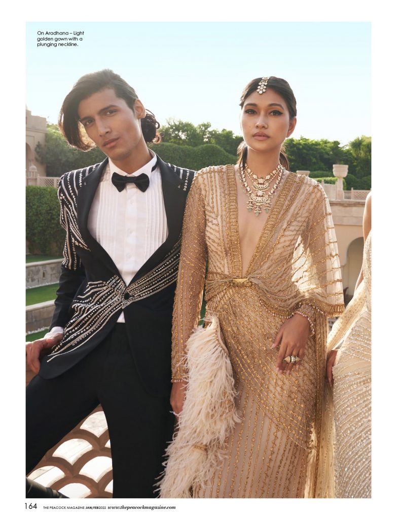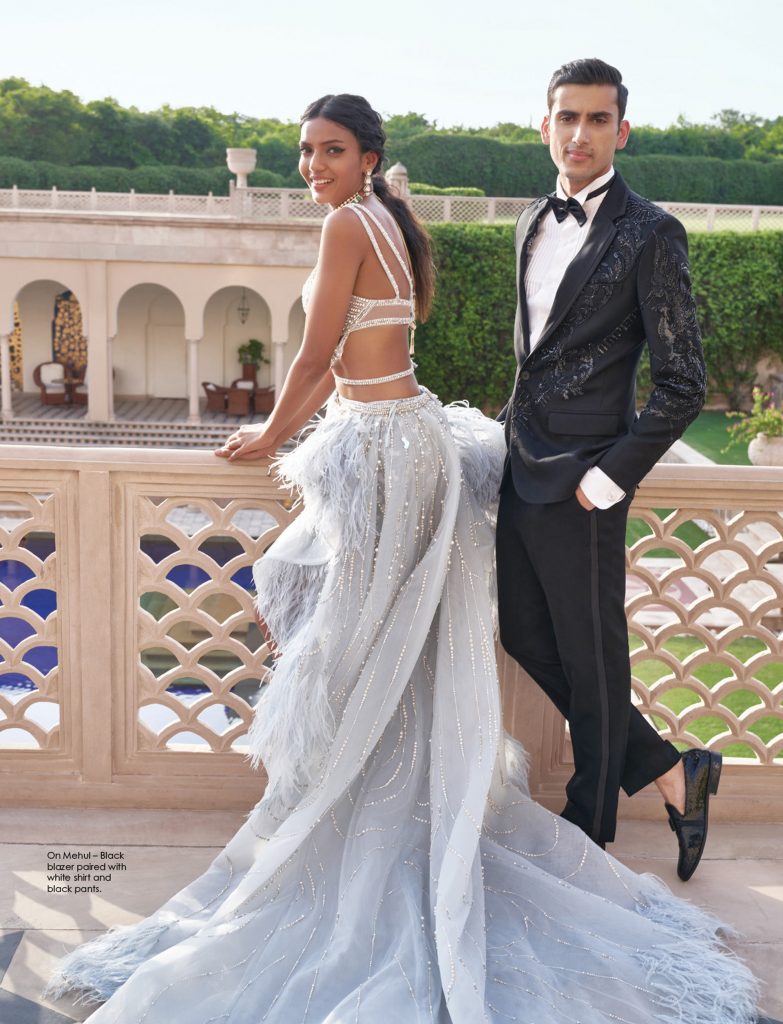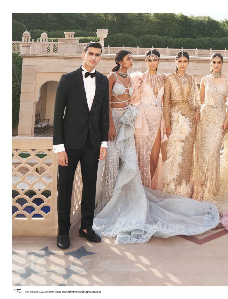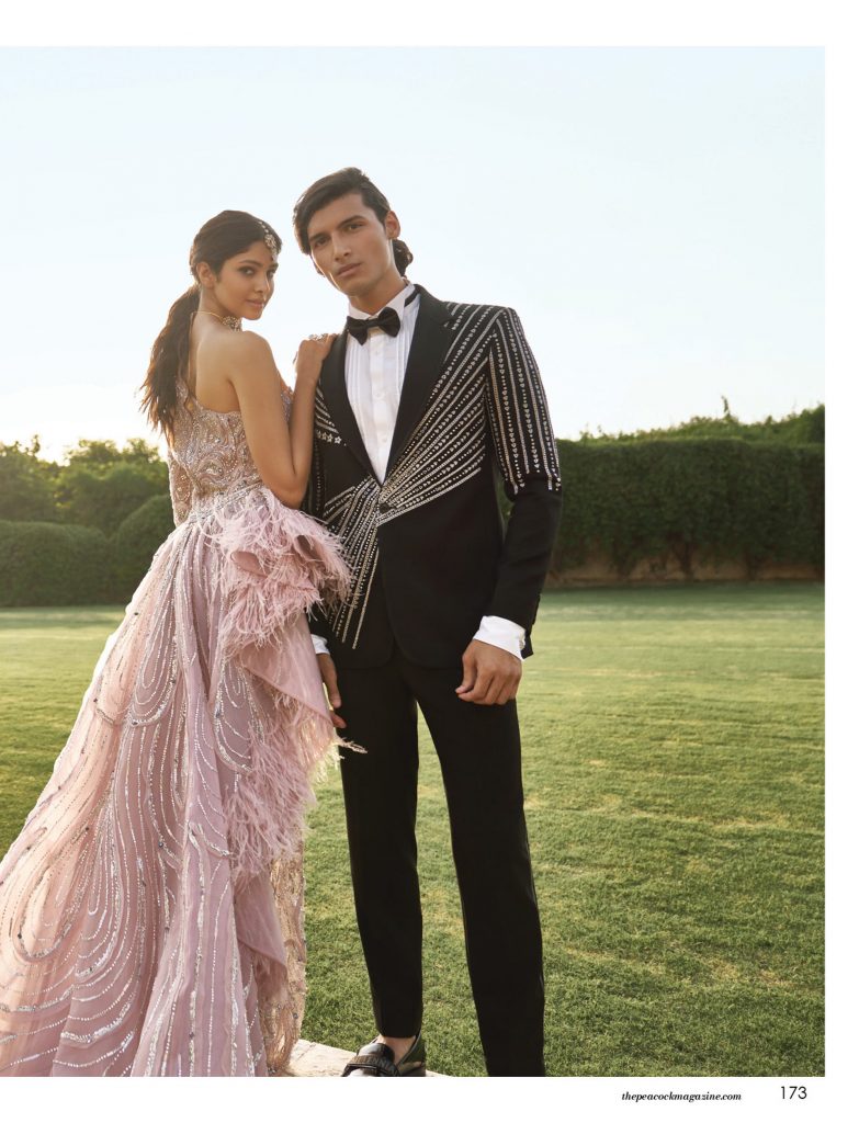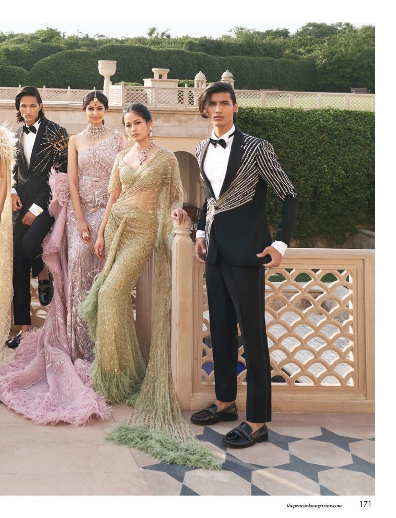 Once deemed as an elaborate garment reserved for the empyreans, gowns are now being refined as couture and garb that spells grandeur and luxury. Depicted in great detail and constructed of indulgent fabrics like raw silk and tulle, these gowns are lavishly adorned with pearls, beads, sequins and crystals and decorated with the most intricate patterns of stitching and embroidery. Against the backdrop of lush lawns of the Oberoi Amarvilas, the glamourous designs and sparkling accents make a statement-worthy look. Pastels dominate the colour palette as we see gowns in powder blue, faded sage green, old rose pink, beige, lilac and light golden sashaying down the magnificent corridors. The plunging necklines, thigh-high slits and distinctive sleeves, set the tone for any over-the-top occasion. Complementing the ladies are men sporting the sleek Falguni Shane Peacock blazers and adding a dash of dapper to complete the look.