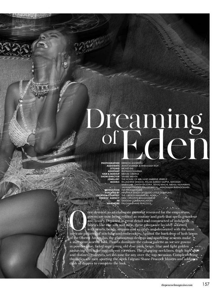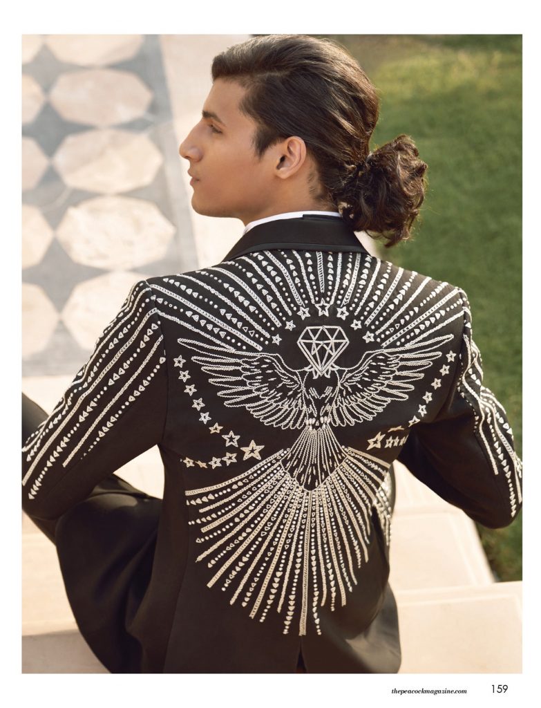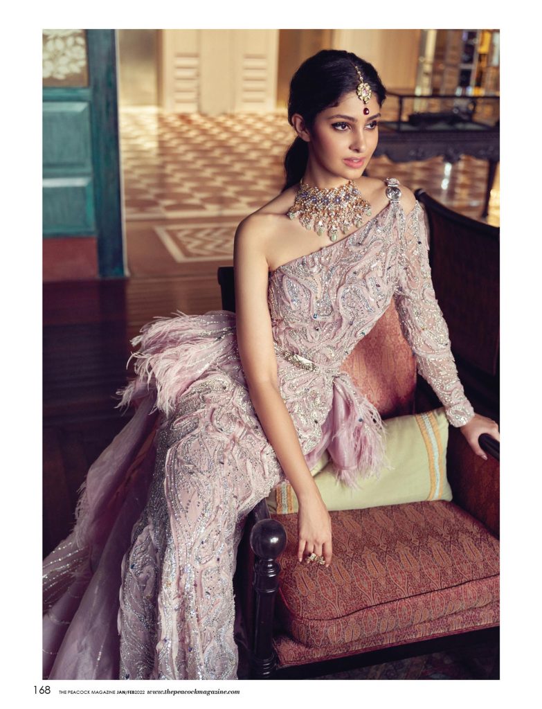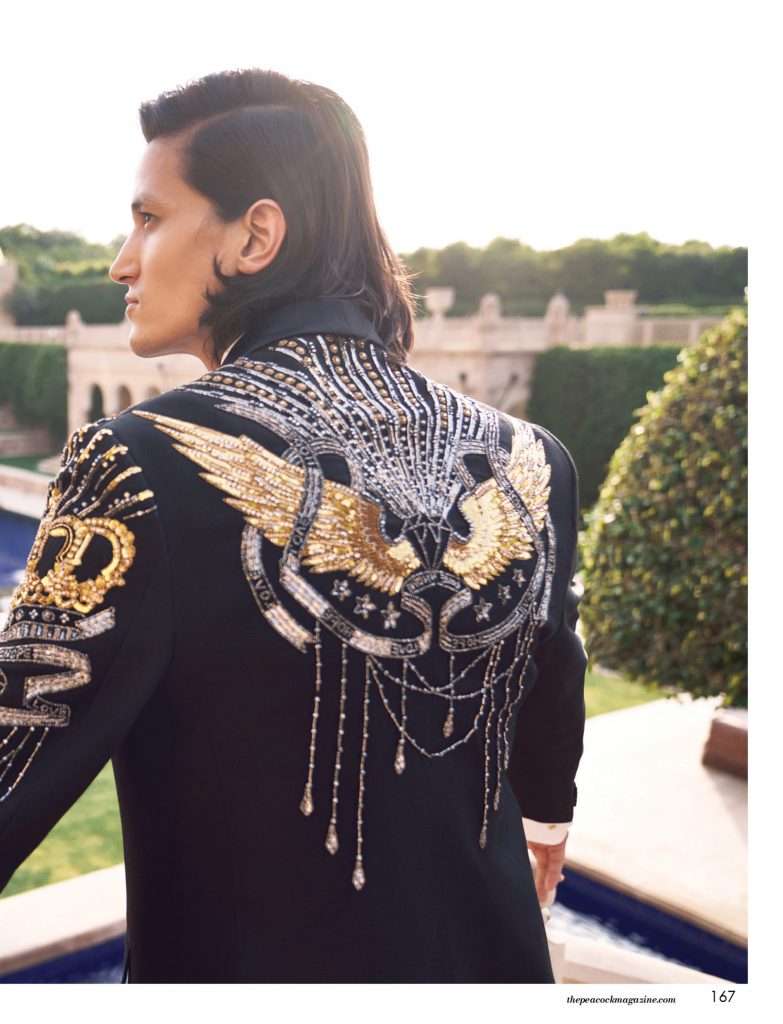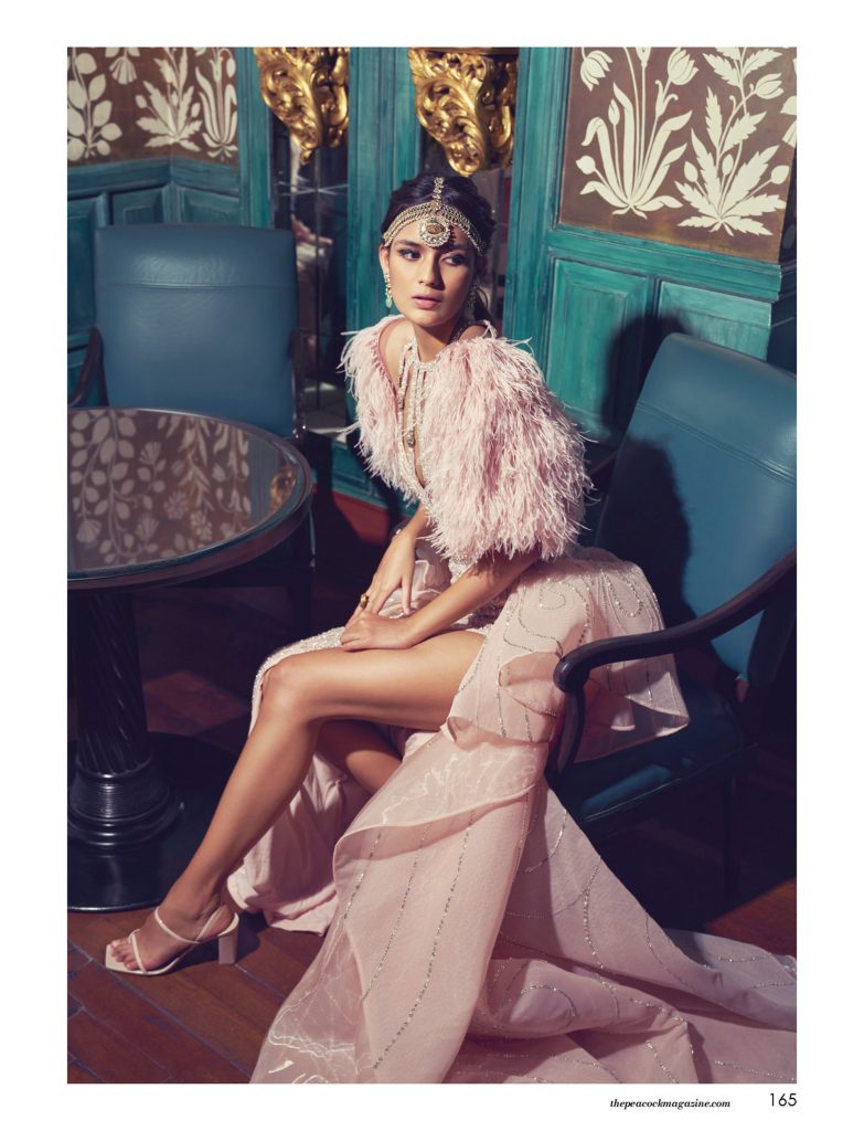 Once deemed as an elaborate garment reserved for the empyreans, gowns are now being refined as couture and garb that spells grandeur and luxury. Depicted in great detail and constructed of indulgent fabrics like raw silk and tulle, these gowns are lavishly adorned with pearls, beads, sequins and crystals and decorated with the most intricate patterns of stitching and embroidery. Against the backdrop of lush lawns of the Oberoi Amarvilas, the glamourous designs and sparkling accents make a statement-worthy look. Pastels dominate the colour palette as we see gowns in powder blue, faded sage green, old rose pink, beige, lilac and light golden sashaying down the magnificent corridors. The plunging necklines, thigh-high slits and distinctive sleeves, set the tone for any over-the-top occasion. Complementing the ladies are men sporting the sleek Falguni Shane Peacock blazers and adding a dash of dapper to complete the look.