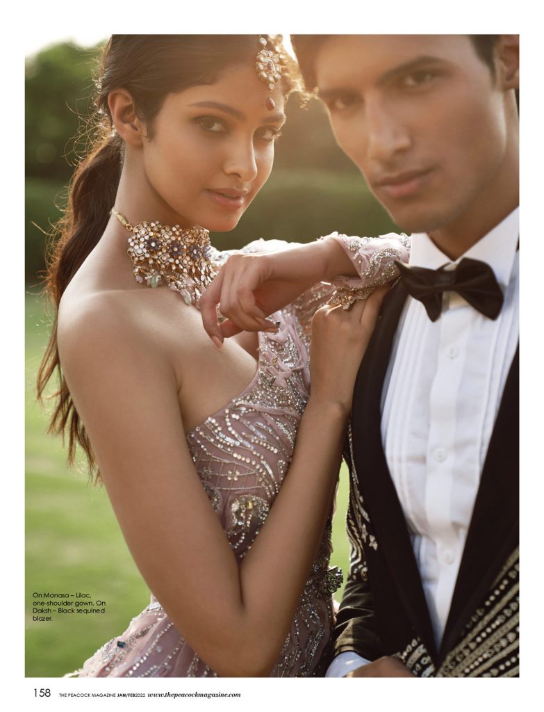 On Manasa – Lilac, one-shoulder gown. On Daksh – Black sequined blazer.