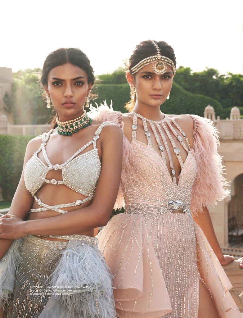 On Palak – Powder blue, cutout gown with a trail. On Sehaz – Powder pink gown with a plunging neckline and peplum.