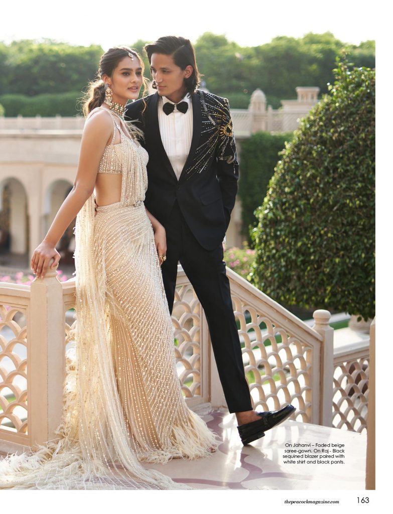 On Jahanvi – Faded beige saree-gown. On Raj – Black sequined blazer paired with white shirt and black pants.