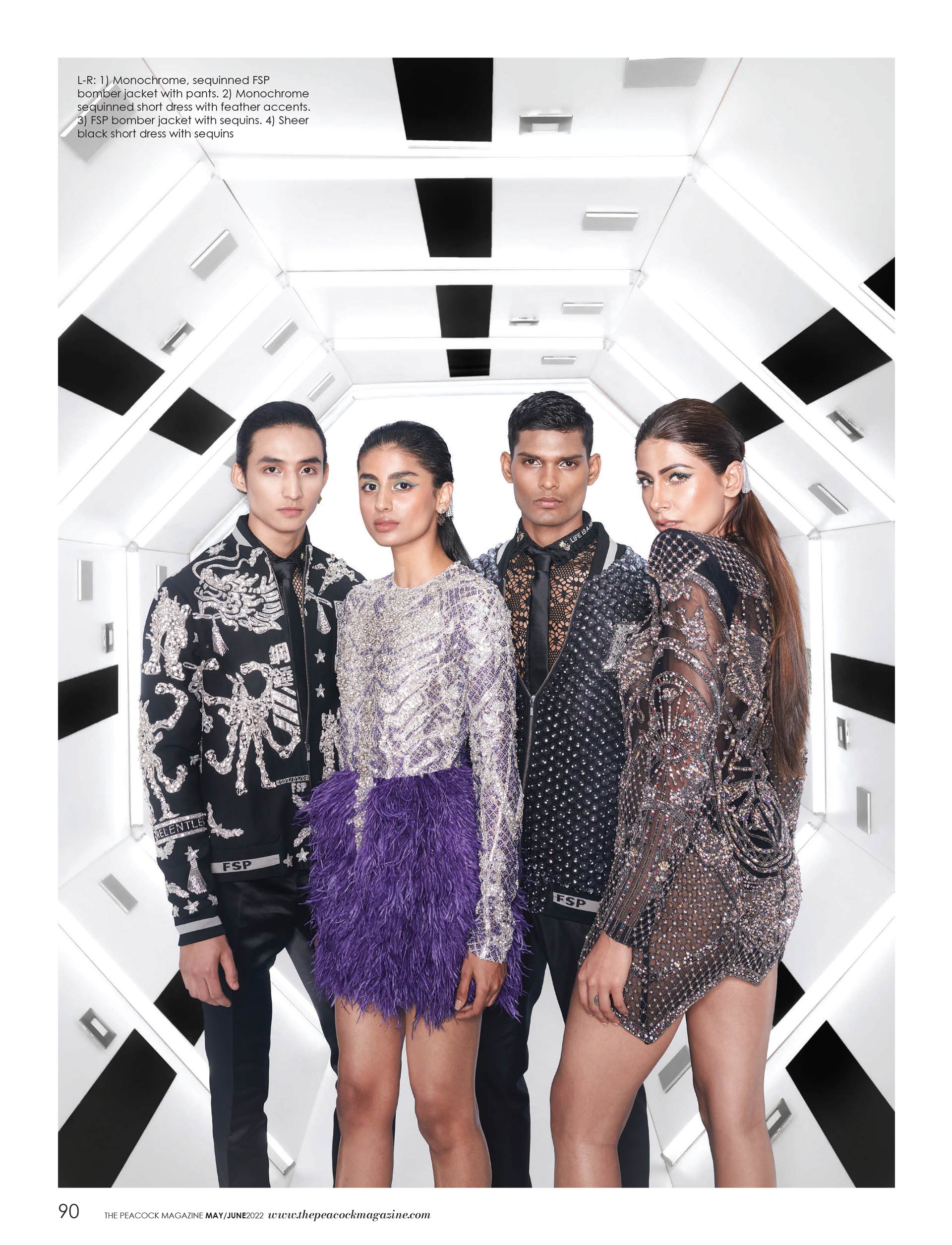 ‘Earthbound’ is an ode to the styles we donned when on Earth. The collection bridges the styles between the yesteryear classics and the current futuristic, an almost pyramidal fusion of many creatures and motherboards of random objects. The story is set in the 80’s time travel to the Earth. Earth being paid a tribute to–it is a celebration of once having the luxury to wear the glamorous wave of maximal fashion that appears straight from the ’80s. Big and bold shoulders, bright colours, and plenty of rock chic, edgy, unconventionally futuristic outfits and statement styles making fashion fun once again. The amalgamation of real with virtual results in over accentuated, highly stylised silhouettes with splashes of crystals, dome shaped diamanté’s, abstract sequins, and faceted beads mixed with the unmistakable rock chic elements, think: reimagined bodysuits and short bodycon dresses with striking cutouts, and unique hemlines–giving it a modern, glamourous homage to futuristic and space age.