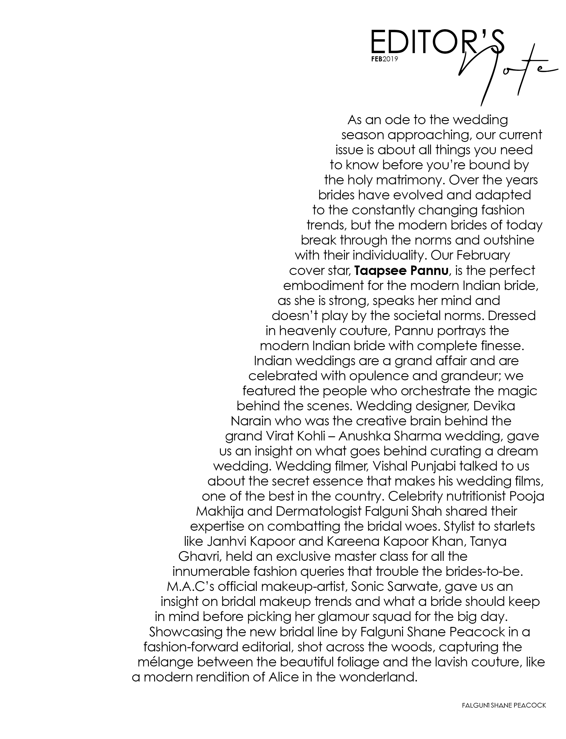 As an ode to the wedding season approaching, our current issue is about all things you need to know before you’re bound by the holy matrimony. Over the years brides have evolved and adapted to the constantly changing fashion trends, but the modern brides of today break through the norms and outshine with their individuality. Our February cover star, Taapsee Pannu, is the perfect embodiment for the modern Indian bride, as she is strong, speaks her mind and doesn’t play by the societal norms. Dressed in heavenly couture, Pannu portrays the modem Indian bride with complete finesse. Indian weddings are a grand affair and are celebrated with opulence and grandeur; we featured the people who orchestrate the magic behind the scenes. Wedding designer, Devika Nordin who was the creative brain behind the grand Virat Kohli – Anushka Sharma wedding, gave us an insight on what goes behind curating a dream wedding. Wedding filmer, Vishal Punjabi talked to us about the secret essence that makes his wedding films, one of the best in the country. Celebrity nutritionist Pooja Makhija and Dermatologist Falguni Shah shared their expertise on combatting the bridal woes. Stylist to starlets like Janhvi Kapoor and Kareena Kapoor Khan, Tanya Ghavri, held an exclusive master class for all the innumerable fashion queries that trouble the brides-to-be. M.A.C’s official makeup-artist, Sonic Sarwate, gave us an insight on bridal makeup trends and what a bride should keep in mind before picking her glamour squad for the big day. Showcasing the new bridal line by Falguni Shane Peacock in a fashion-forward editorial, shot across the woods, capturing the mélange between the beautiful foliage and the lavish couture, like a modern rendition of Alice in the wonderland.