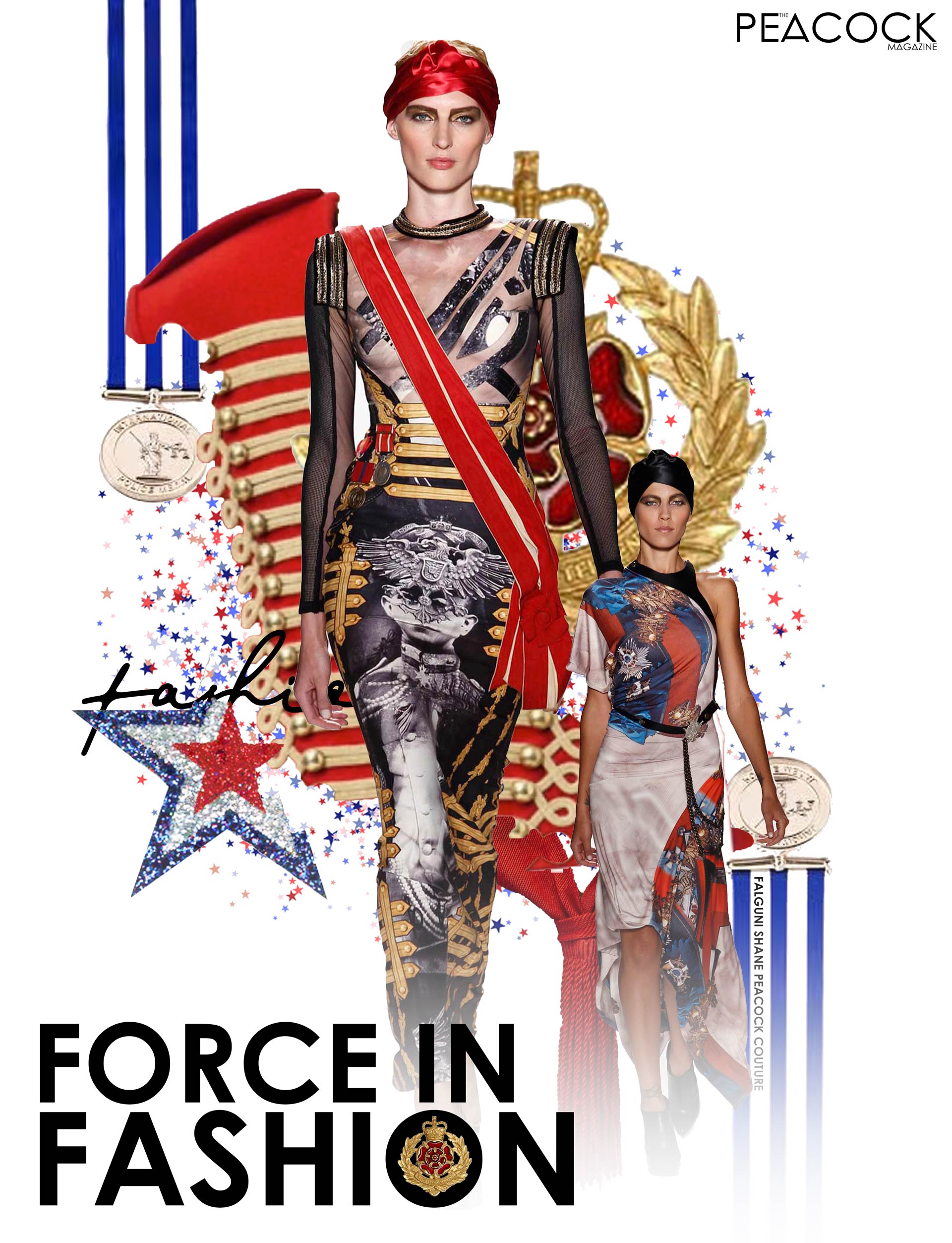 When you think of military fashion, you are instantly drawn to the war-torn shade of olive green and camouflage pattern, but Falguni Shane Peacock’s distinctive take on the army trend is inspired by the 18th century, British and American colonial era. The imperial forces were known for its sharp looks, consisting of a structured red coat with heavy gold and navy blue accents. Military fashion can be rather mundane if incorporated in the conventional way. The idea was to infuse the hero elements from the look in an experimental way. The juxtaposition between Falguni Shane Peacock’s signature opulence and the classic military elegance was seamlessly translated through prints, colours and other little nuances imbibed. Showcased on an international runway, the collection conspired of dresses and gowns, varying in cut, style, colour and length. Each piece was painstakingly created with emphasis laid on details, whether it was the sheer panels overlapping prints, feathers cutting through stripes or strategically placed cut-outs that elevated the glamour level of this line. The colour palette was a mix of crimson, navy blue, black, smoke grey and gold. The cuts and styles of the ensembles were way ahead in the fashion curve, with risqué necklines, sheer panels in the centre front and harness cages defining the design philosophy.