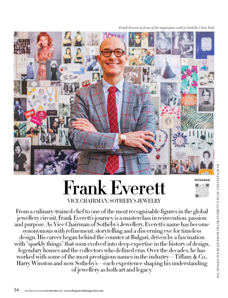 From a culinary-trained chef to one of the most recognisable figures in the global jewellery circuit, Frank Everett’s journey is a masterclass in reinvention, passion and purpose. As Vice Chairman of Sotheby’s Jewellery, Everett’s name has become synonymous with refinement, storytelling and a discerning eye for timeless design. His career began behind the counter at Bulgari, driven by a fascination with “sparkly things” that soon evolved into deep expertise in the history of design, legendary houses and the collectors who defined eras. Over the decades, he has worked with some of the most prestigious names in the industry—Tiffany & Co., Harry Winston and now Sotheby’s—each experience shaping his understanding of jewellery as both art and legacy.