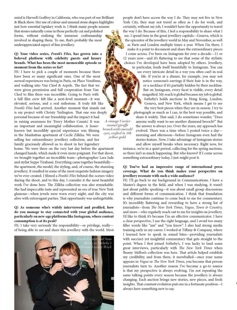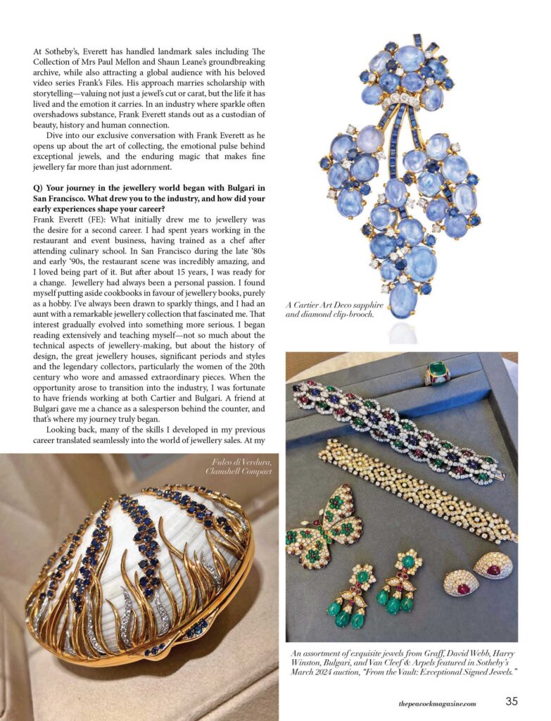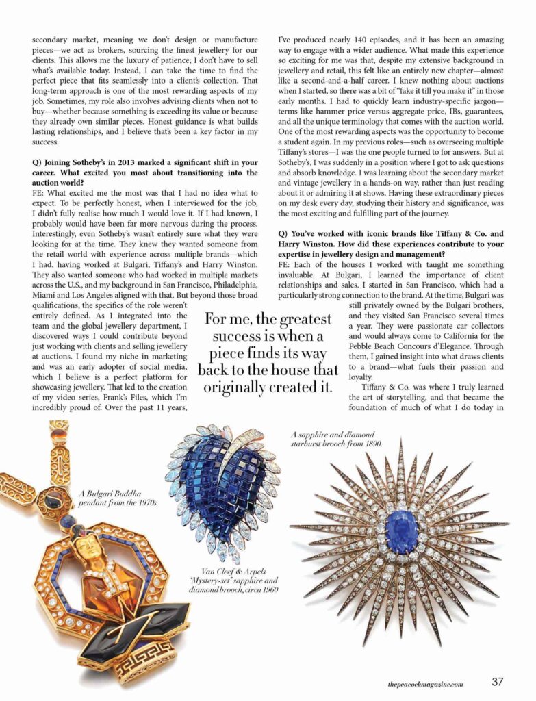 FE: What excited me the most was that I had no idea what to expect. To be perfectly honest, when I interviewed for the job, I didn’t fully realise how much I would love it. If I had known, I probably would have been far more nervous during the process. Interestingly, even Sotheby’s wasn’t entirely sure what they were looking for at the time. They knew they wanted someone from the retail world with experience across multiple brands—which I had, having worked at Bulgari, Tiffany’s and Harry Winston. They also wanted someone who had worked in multiple markets across the U.S., and my background in San Francisco, Philadelphia, Miami and Los Angeles aligned with that. But beyond those broad qualifications, the specifics of the role weren’t entirely defined. As I integrated into the team and the global jewellery department, I discovered ways I could contribute beyond just working with clients and selling jewellery at auctions. I found my niche in marketing and was an early adopter of social media, which I believe is a perfect platform for showcasing jewellery. That led to the creation of my video series, Frank’s Files, which I’m incredibly proud of. Over the past 11 years, I’ve produced nearly 140 episodes, and it has been an amazing way to engage with a wider audience. What made this experience so exciting for me was that, despite my extensive background in jewellery and retail, this felt like an entirely new chapter—almost like a second-and-a-half career. I knew nothing about auctions when I started, so there was a bit of “fake it till you make it” in those early months. I had to quickly learn industry-specific jargon—terms like hammer price versus aggregate price, IBs, guarantees, and all the unique terminology that comes with the auction world. One of the most rewarding aspects was the opportunity to become a student again. In my previous roles—such as overseeing multiple Tiffany’s stores—I was the one people turned to for answers. But at Sotheby’s, I was suddenly in a position where I got to ask questions and absorb knowledge. I was learning about the secondary market and vintage jewellery in a hands-on way, rather than just reading about it or admiring it at shows. Having these extraordinary pieces on my desk every day, studying their history and significance, was the most exciting and fulfilling part of the journey.
