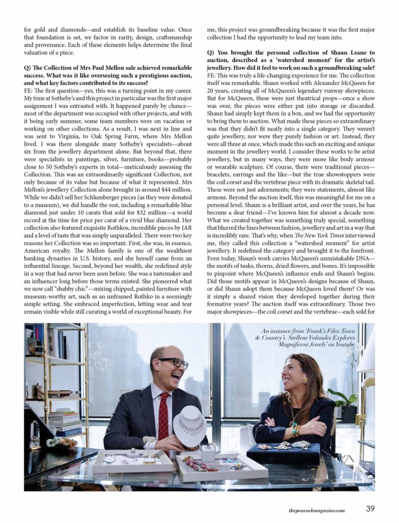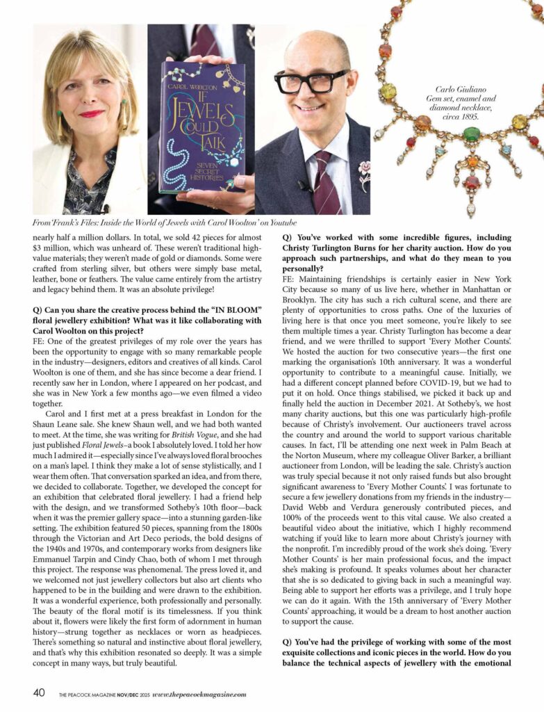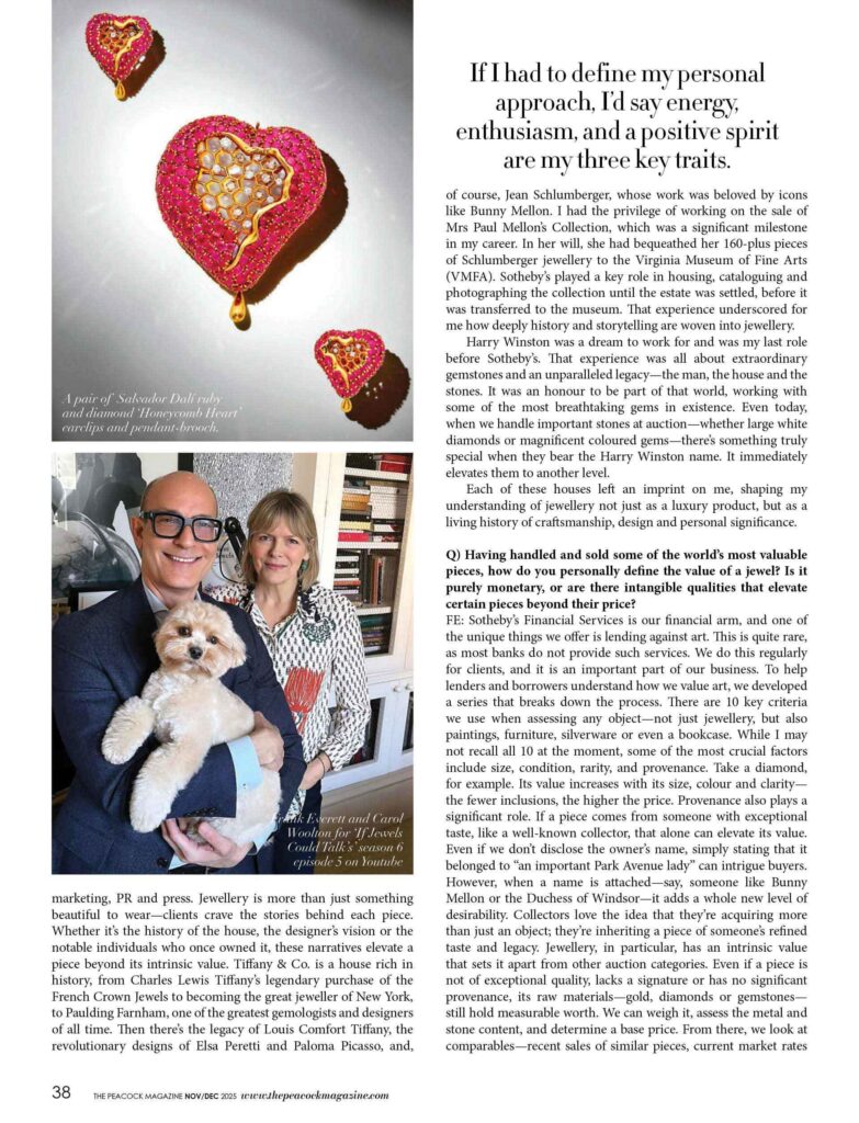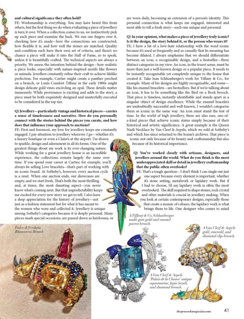 FE: I’ll go back to my background in Communications. I have a Master’s degree in the field, and when I was studying, it wasn’t just about public speaking—it was about small group discussions and different forms of communication. I think that foundation is why journalists continue to come back to me for commentary. It’s incredibly flattering and rewarding to have a strong list of journalists—from The New York Times, Vogue, Town & Country, and more—who regularly reach out to me for insights on jewellery. I’d like to think it’s because I’m an effective communicator. I have a clear perspective, I use the right language, and I avoid too many filler words like “um” and “you know”. I also had strong media training early in my career. I worked at Tiffany & Company, where I learned how to speak in sound bites—providing journalists with succinct yet insightful commentary that gets straight to the point. When I first joined Sotheby’s, I was lucky to land some great interviews, particularly with The New York Times when Bunny Mellon’s collection was here. That article helped establish my credibility, and from there, it snowballed—once your name appears in Vogue or The New York Times, you become that person journalists turn to. Another reason I’ve become a go-to source is that my perspective is always evolving. I’m not repeating the same talking points every season because the jewellery is always changing. Each auction brings new stories, new pieces, and fresh insights. That constant evolution puts me in a fortunate position—I always have something new to say.