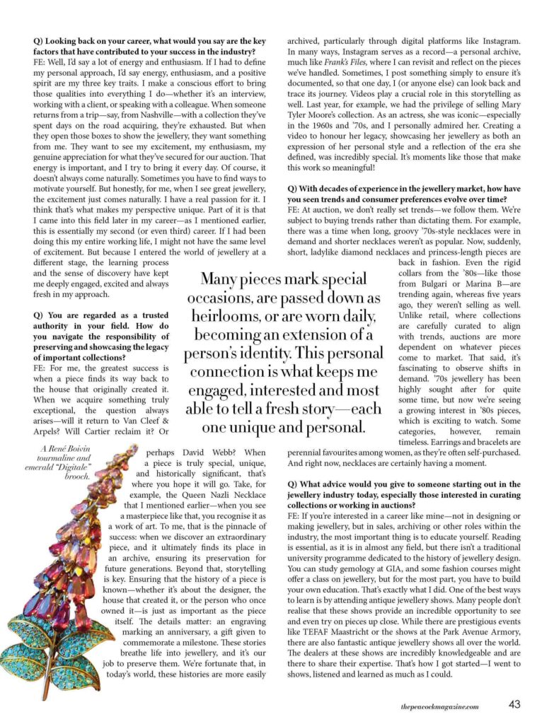 FE: For me, the greatest success is when a piece finds its way back to the house that originally created it. When we acquire something truly exceptional, the question always arises—will it return to Van Cleef & Arpels? Will Cartier reclaim it? Or perhaps David Webb? When a piece is truly special, unique, and historically significant, that’s where you hope it will go. Take, for example, the Queen Nazli Necklace that I mentioned earlier—when you see a masterpiece like that, you recognise it as a work of art. To me, that is the pinnacle of success: when we discover an extraordinary piece, and it ultimately finds its place in an archive, ensuring its preservation for future generations. Beyond that, storytelling is key. Ensuring that the history of a piece is known—whether it’s about the designer, the house that created it, or the person who once owned it—is just as important as the piece itself. The details matter: an engraving marking an anniversary, a gift given to commemorate a milestone. These stories breathe life into jewellery, and it’s our job to preserve them. We’re fortunate that, in today’s world, these histories are more easily archived, particularly through digital platforms like Instagram. In many ways, Instagram serves as a record—a personal archive, much like Frank’s Files, where I can revisit and reflect on the pieces we’ve handled. Sometimes, I post something simply to ensure it’s documented, so that one day, I (or anyone else) can look back and trace its journey. Videos play a crucial role in this storytelling as well. Last year, for example, we had the privilege of selling Mary Tyler Moore’s collection. As an actress, she was iconic—especially in the 1960s and ’70s, and I personally admired her. Creating a video to honour her legacy, showcasing her jewellery as both an expression of her personal style and a reflection of the era she defined, was incredibly special. It’s moments like those that make this work so meaningful!