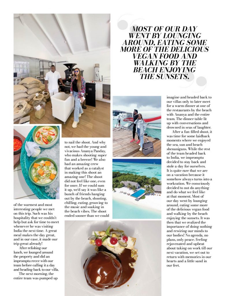 The next morning, the entire team was pumped up to nail the shoot. And why not, we had the young and vivacious Ananya Panday, who makes shooting super fun and a breeze! We also had an amazing crew that worked as a catalyst in making this shoot an amazing one! The shoot did not feel like one, even for once. If we could sum it up, we’d say it was like a bunch of friends hanging out by the beach, shooting, chilling, eating, grooving to the music and soaking in the beach vibes. The shoot ended sooner than we could imagine and headed back to our villas only to later meet for a warm dinner at one of the restaurants by the beach with Ananya and the entire team. The dinner table lit up with conversations and drowned in seas of laughter.