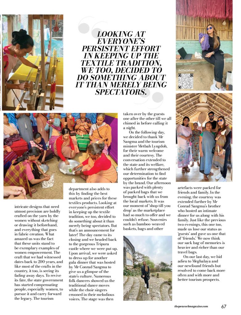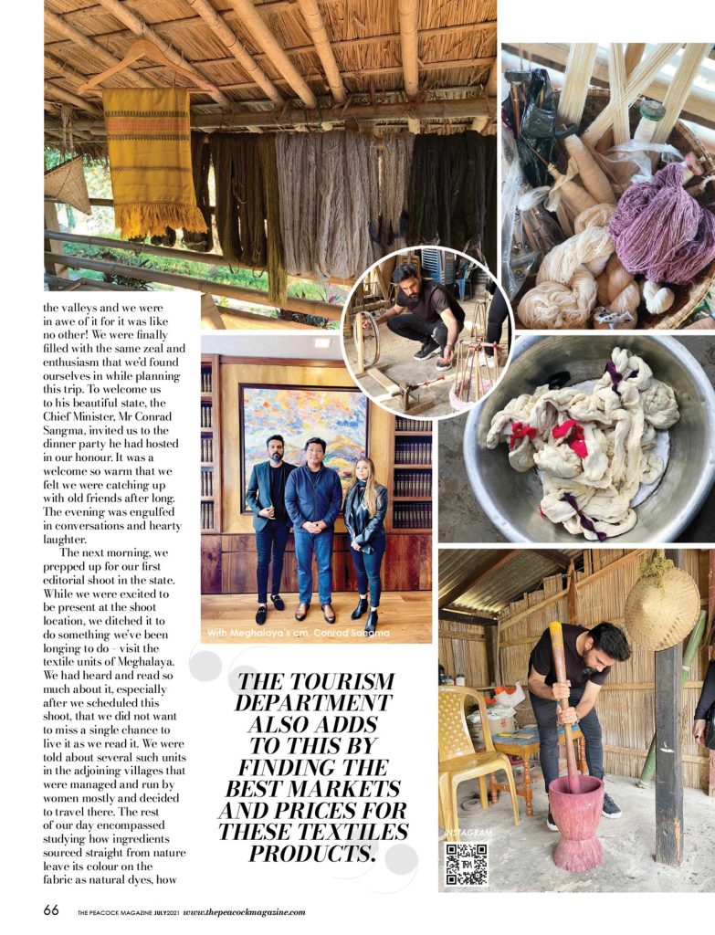 The next morning, we prepped up for our first editorial shoot in the state. While we were excited to be present at the shoot location, we ditched it to do something we’ve been longing to do — visit the textile units of Meghalaya. We had heard and read so much about it, especially after we scheduled this shoot, that we did not want to miss a single chance to live it as we read it. We were told about several such units in the adjoining villages that were managed and run by women mostly, and so we decided to travel there. The rest of our day encompassed studying how ingredients sourced straight from nature leave their colour on the fabric as natural dyes, how intricate designs that need utmost precision are boldly crafted on the yarn by the craftswomen without sketching or drawing it beforehand, and everything that goes in fabric creation. What amazed us was the fact that these units stand to be exemplary examples of women empowerment. The craft that we had witnessed dates back to 200 years, and like most of the crafts in the country, it too, is fading away. To revive its fate, the state government has started compensating people, especially women, to pursue it and carry forward the legacy. The tourism department also adds to this by finding the best markets and prices for these textile products. Looking at everyone’s persistent efforts in reviving the textile tradition, we too decided to do something about it rather than merely being spectators. But that’s an announcement for later! The day came to its closing and we headed back to the gorgeous Tripura castle where we were put up. Upon arrival, we were asked to dress up for another gala dinner that was hosted by Mr Conrad Sangma to give us a glimpse of the state’s culture. Numerous folk dancers showed us the traditional dance moves while the choir singers crooned in their melodious voices. The stage was then taken over by the guests one after the other till we all chimed in before calling it a night.
