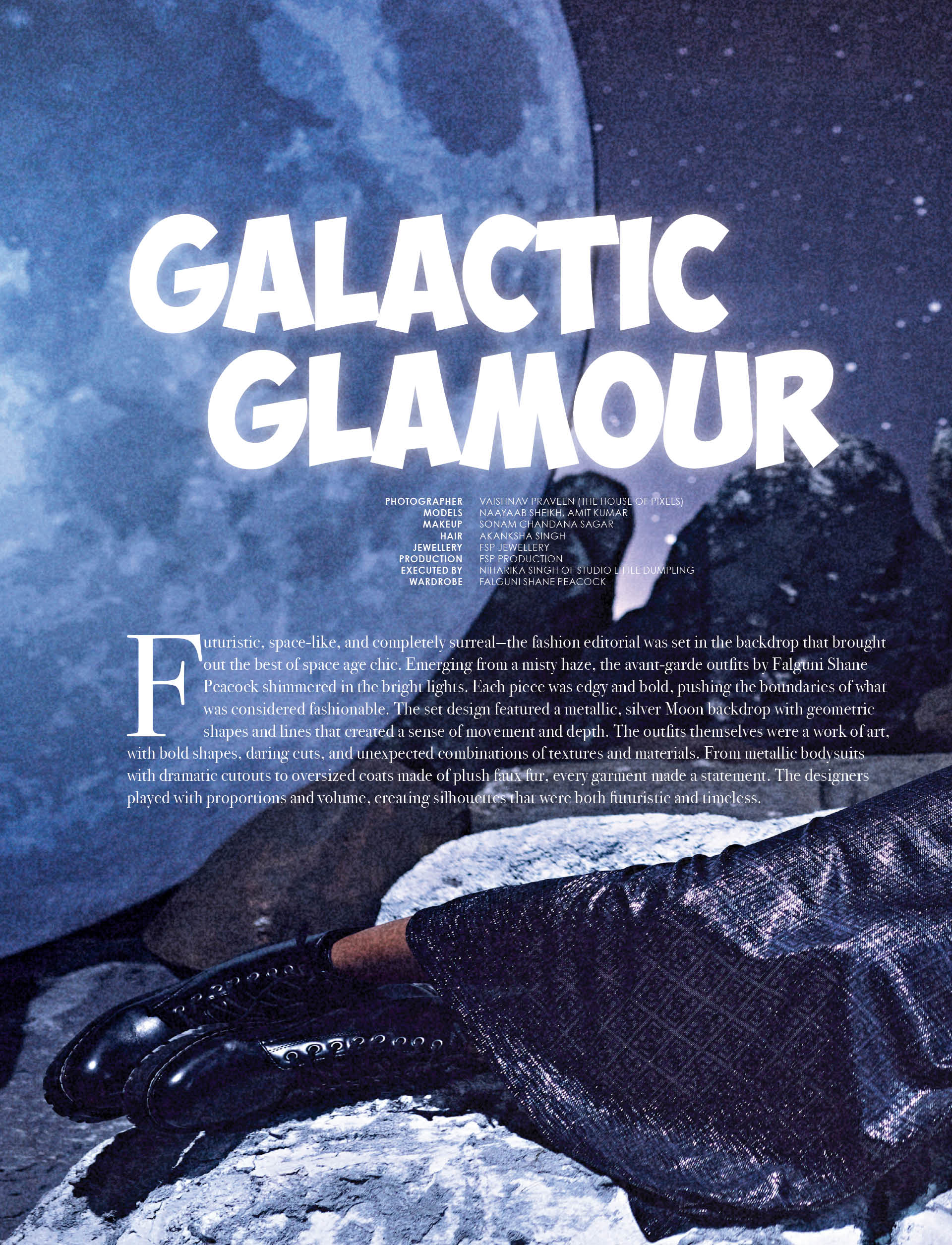 Futuristic, space-like, and completely surreal—the fashion editorial was set in the backdrop that brought out the best of space-age chic. Emerging from a misty haze, the avant-garde outfits by Falguni Shane Peacock shimmered in the bright lights. Each piece was edgy and bold, pushing the boundaries of what is considered fashionable. The set design featured a metallic, silver moon backdrop with geometric shapes and lines that created a sense of movement and depth. The outfits themselves were a work of art starring bold shapes, daring cuts and unexpected combinations of textures and materials. From metallic bodysuits with dramatic cutouts to oversized coats made of plush faux fur, every garment made a statement. The designers played with proportions and volume, creating silhouettes that were both futuristic and timeless.