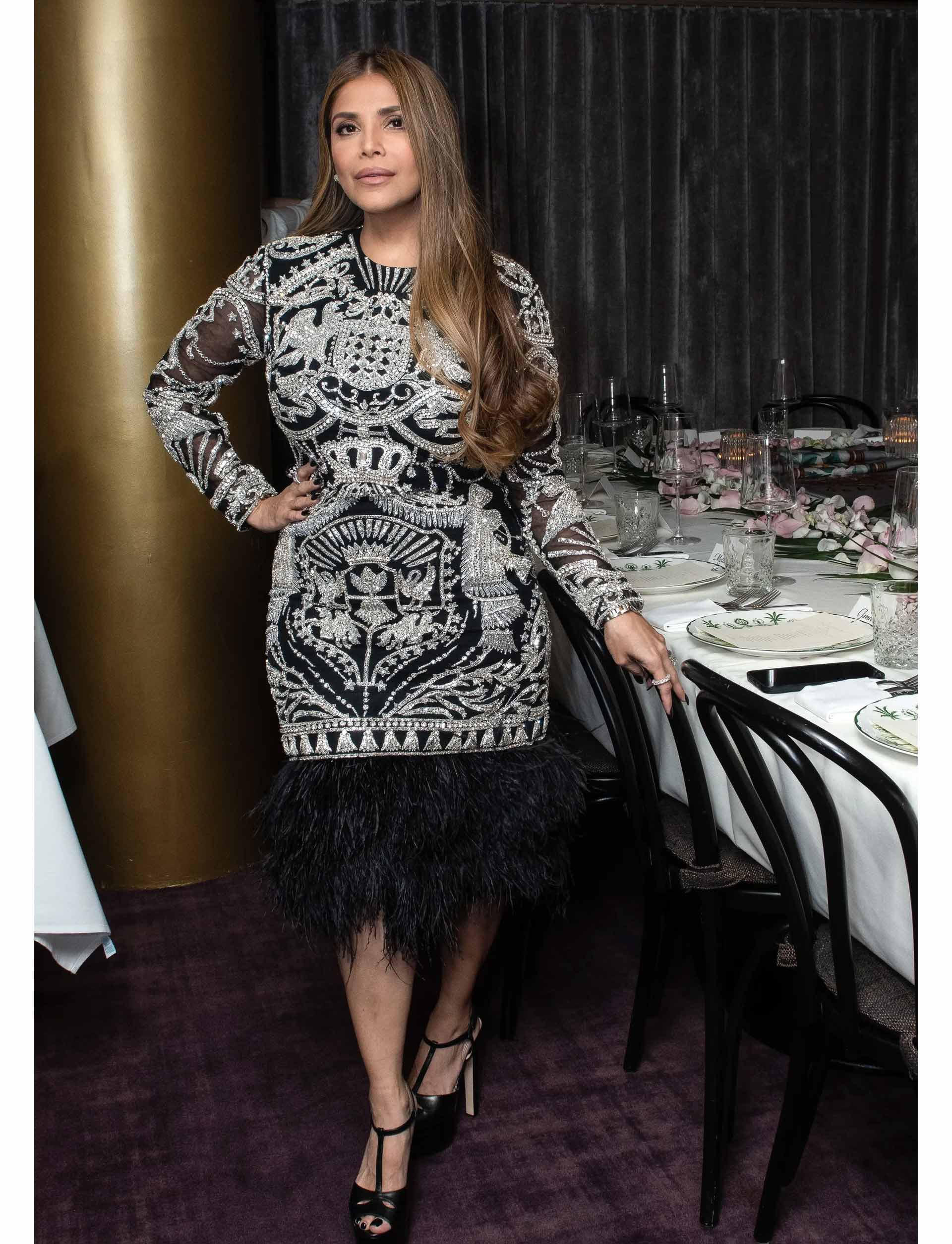 Over a table scape of roses, orchids and palm leaves (to match the tropical crockery by William Edwards) Goyal pointed out a striking custom silk table runner designed by the couple for the occasion. “I opened Sona a year ago as my gift to New York,” admitted the restauranter. “To showcase India and Indian food in an entirely new way that no one has seen before. Tonight, I wanted to bring together the best of New York with guests from fashion, media and talent.”