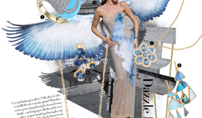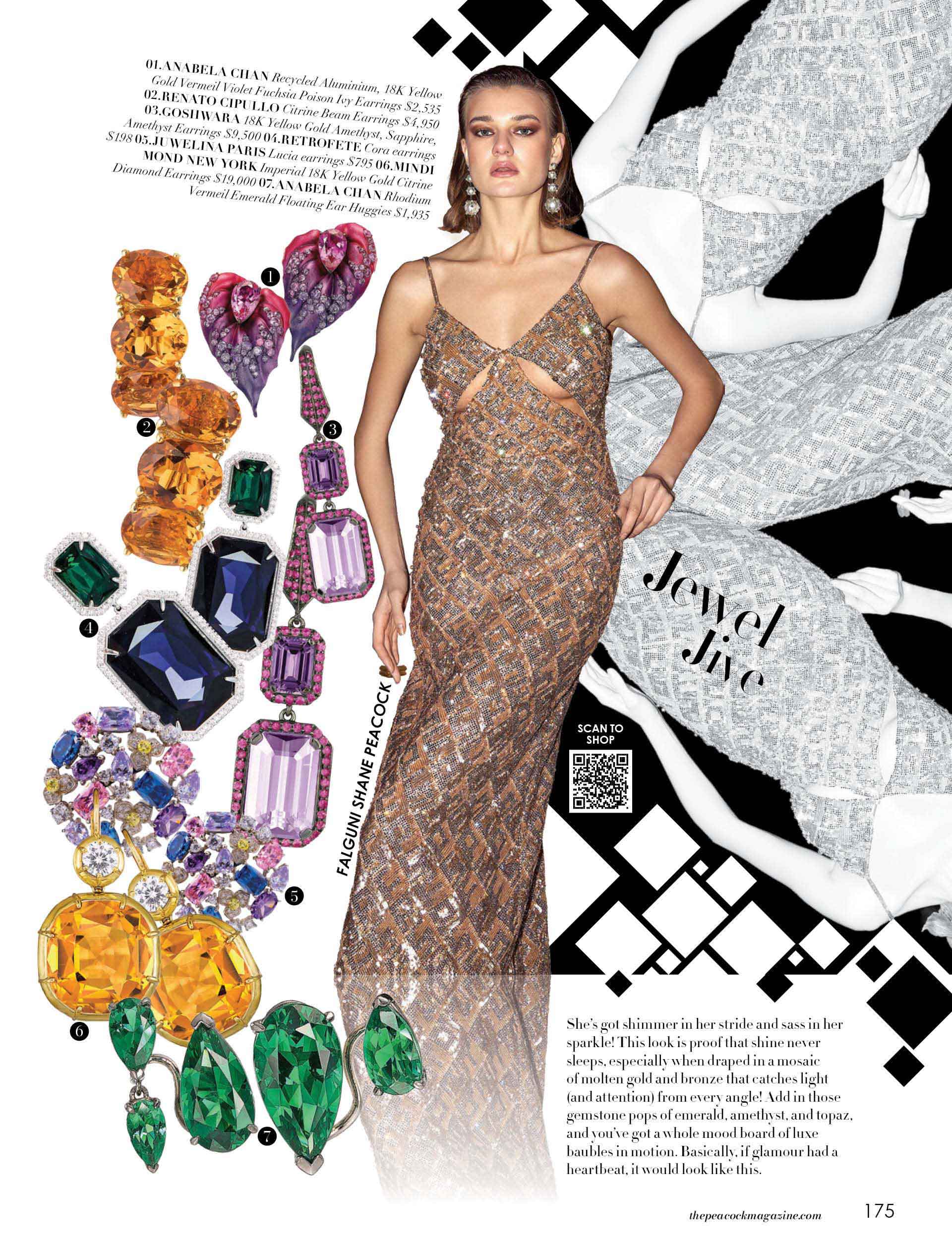 She’s got shimmer in her stride and sass in her sparkle! This look is proof that shine never sleeps, especially when draped in a mosaic of molten gold and bronze that catches light (and attention) from every angle! Add in those gemstone pops of emerald, amethyst, and topaz, and you’ve got a whole mood board of luxe baubles in motion. Basically, if glamour had a heartbeat, it would look like this.