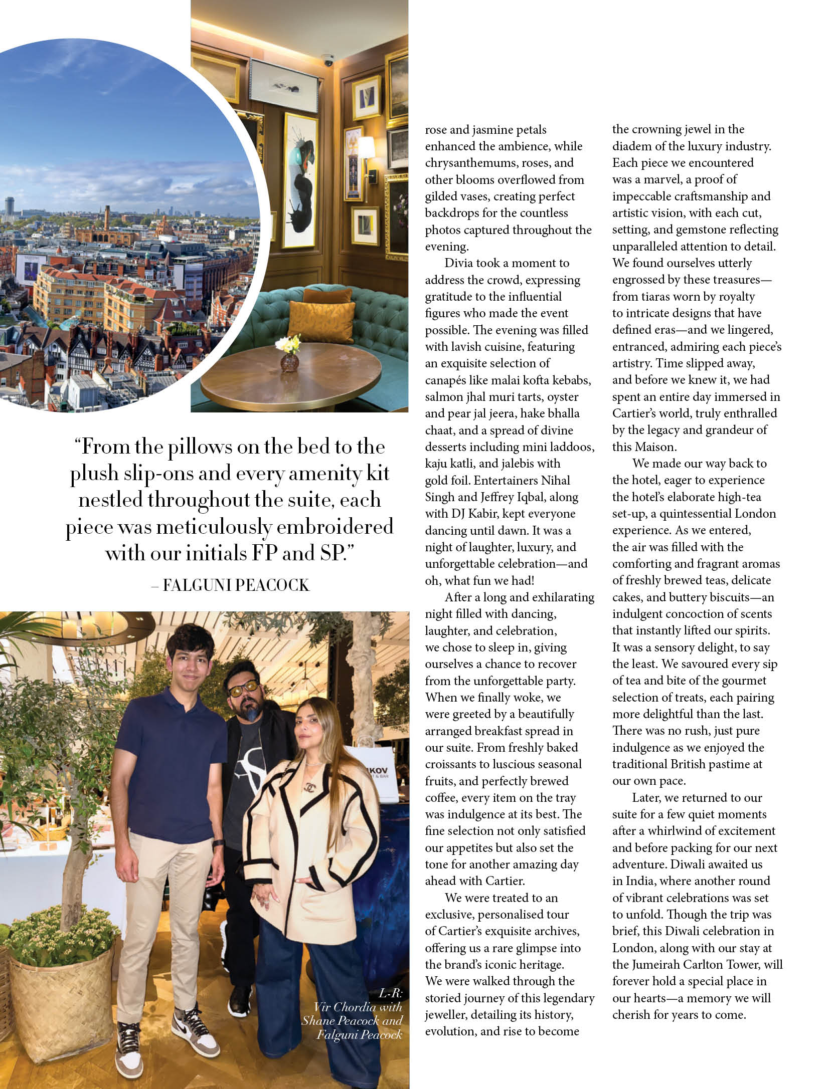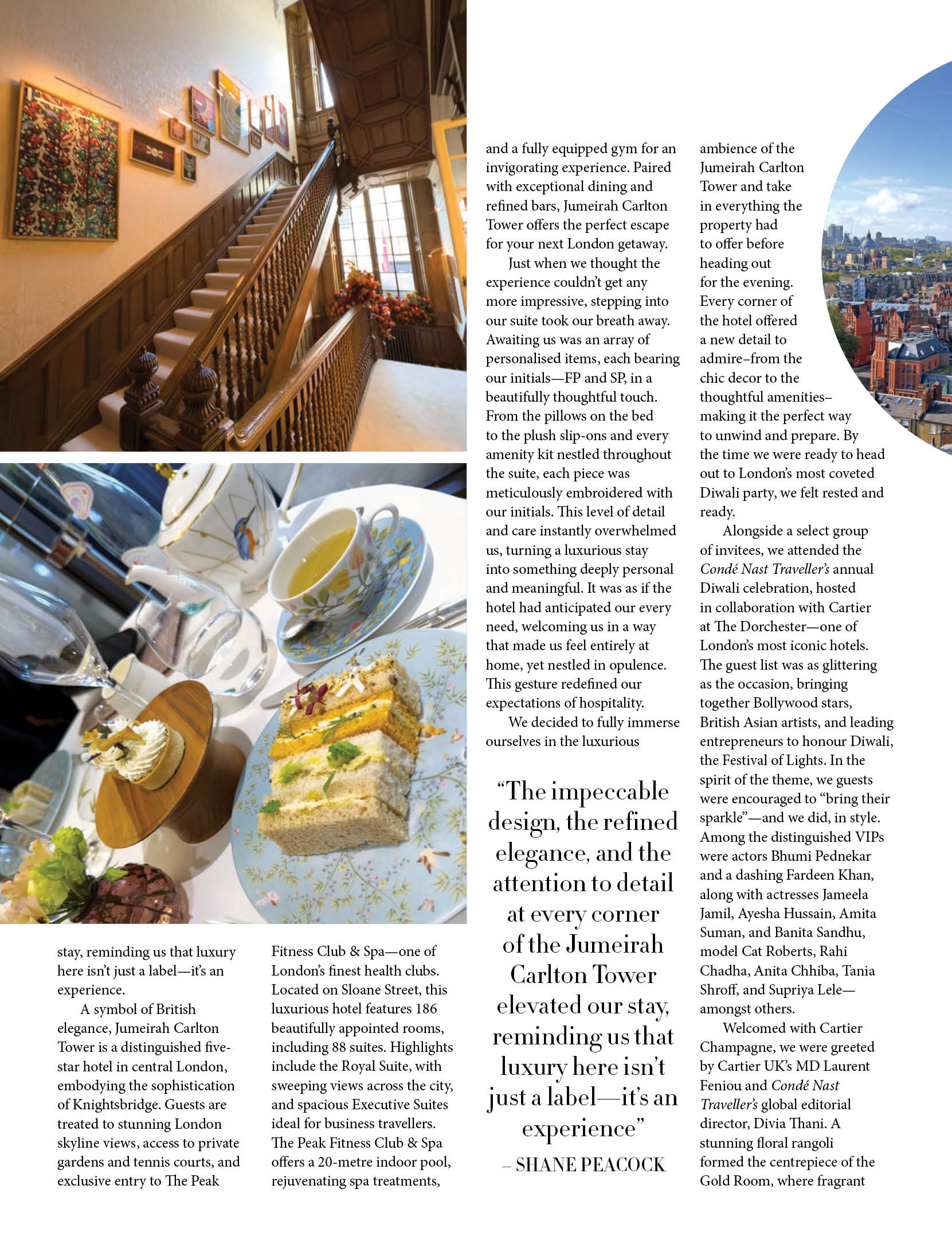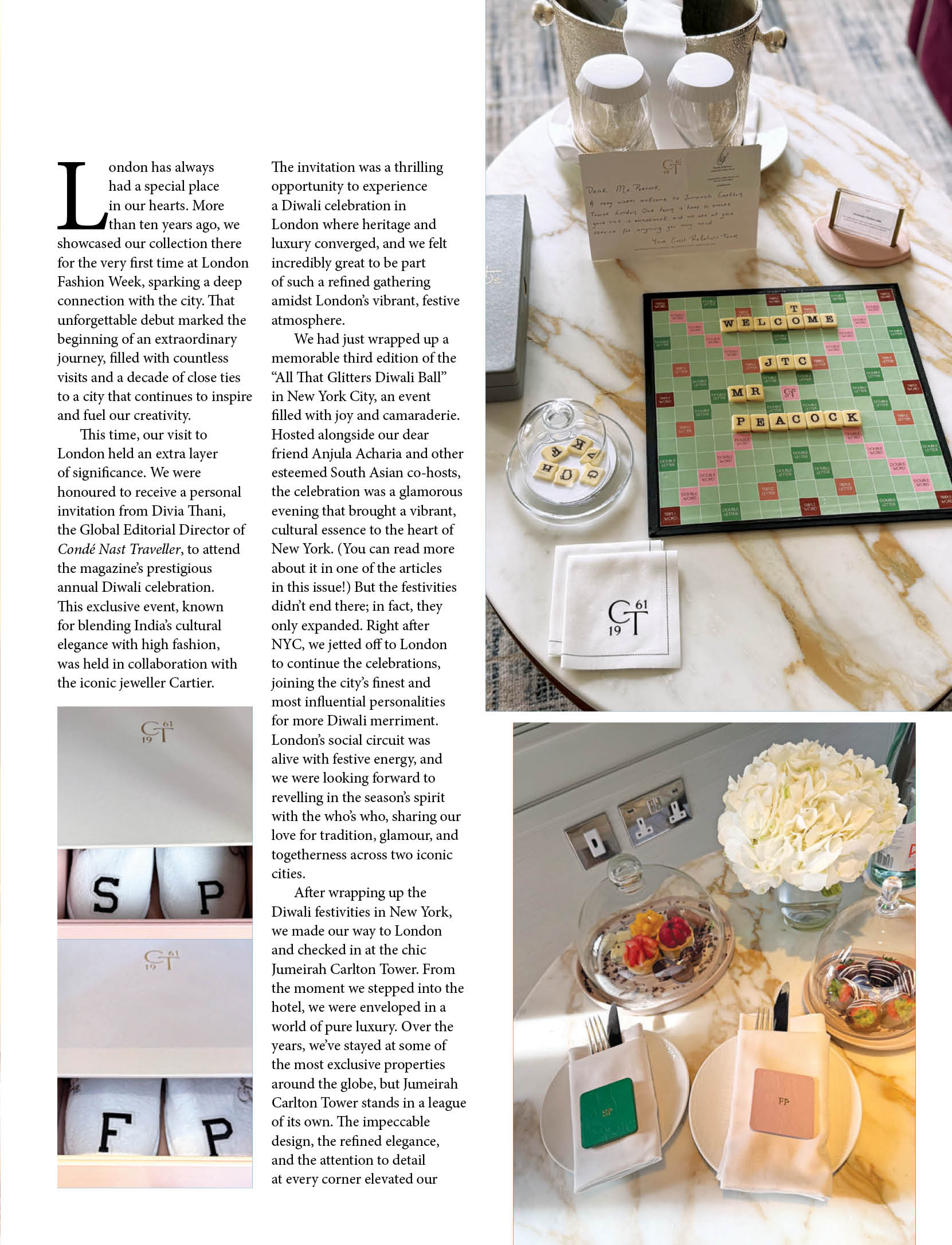 We had just wrapped up a memorable third edition of the “All That Glitters Diwali Ball” in New York City, an event filled with joy and camaraderie. Hosted alongside our dear friend Anjula Acharia and other esteemed South Asian co-hosts, the celebration was a glamorous evening that brought a vibrant, cultural essence to the heart of New York. (You can read more about it in one of the articles in this issue!) But the festivities didn’t end there; in fact, they only expanded. Right after NYC, we jetted off to London to continue the celebrations, joining the city’s finest and most influential personalities for more Diwali merriment. London’s social circuit was alive with festive energy, and we were looking forward to revelling in the season’s spirit with the who’s who, sharing our love for tradition, glamour, and togetherness across two iconic cities.