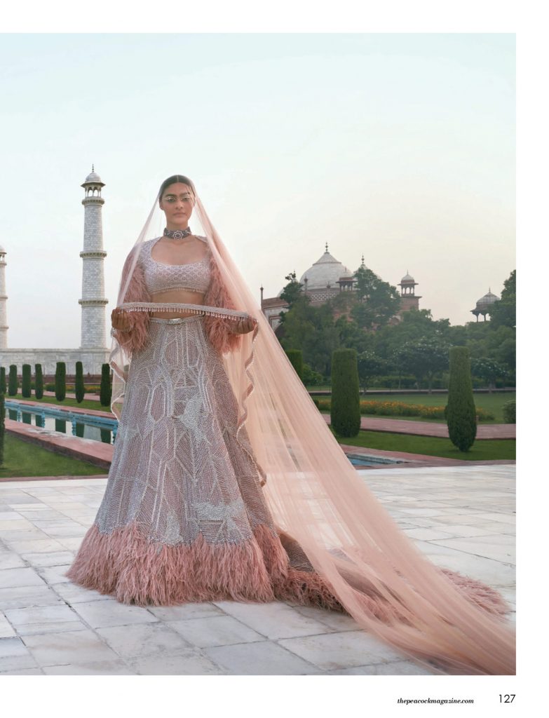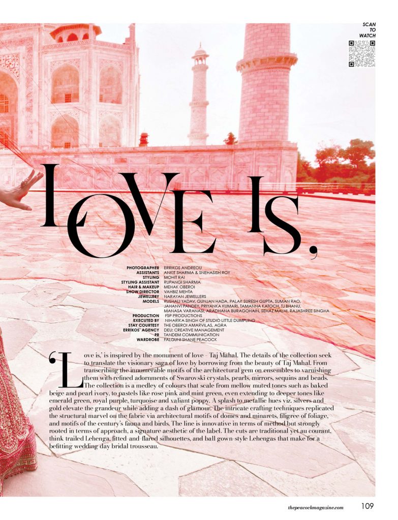 ‘Love is,’ is inspired by the monument of love – Taj Mahal. The details of the collection seek to translate the visionary saga of love by borrowing from the beauty of Taj Mahal. From transcribing the innumerable motifs of the architectural gem on ensembles to varnishing them with refined adornments of Swarovski crystals, pearls, mirrors, sequins and beads. The collection is a medley of colours that scale from mellow muted tones such as baked beige and pearl ivory, to pastels like rose pink and mint green, even extending to deeper tones like emerald green, royal purple, turquoise and valiant poppy. A splash to metallic hues viz. silvers and gold elevate the grandeur while adding a dash of glamour. The intricate crafting techniques replicated the structural marvel on the fabric via architectural motifs of domes and minarets, filigree of foliage, and motifs of the century’s fauna and birds. The line is innovative in terms of method but strongly rooted in terms of approach, a signature aesthetic of the label. The cuts are traditional yet au courant, think trailed Lehenga, fitted-and-flared silhouettes, and ball gown-style Lehengas that make for a befitting wedding day bridal trousseau.