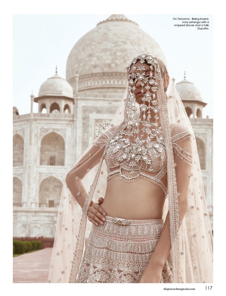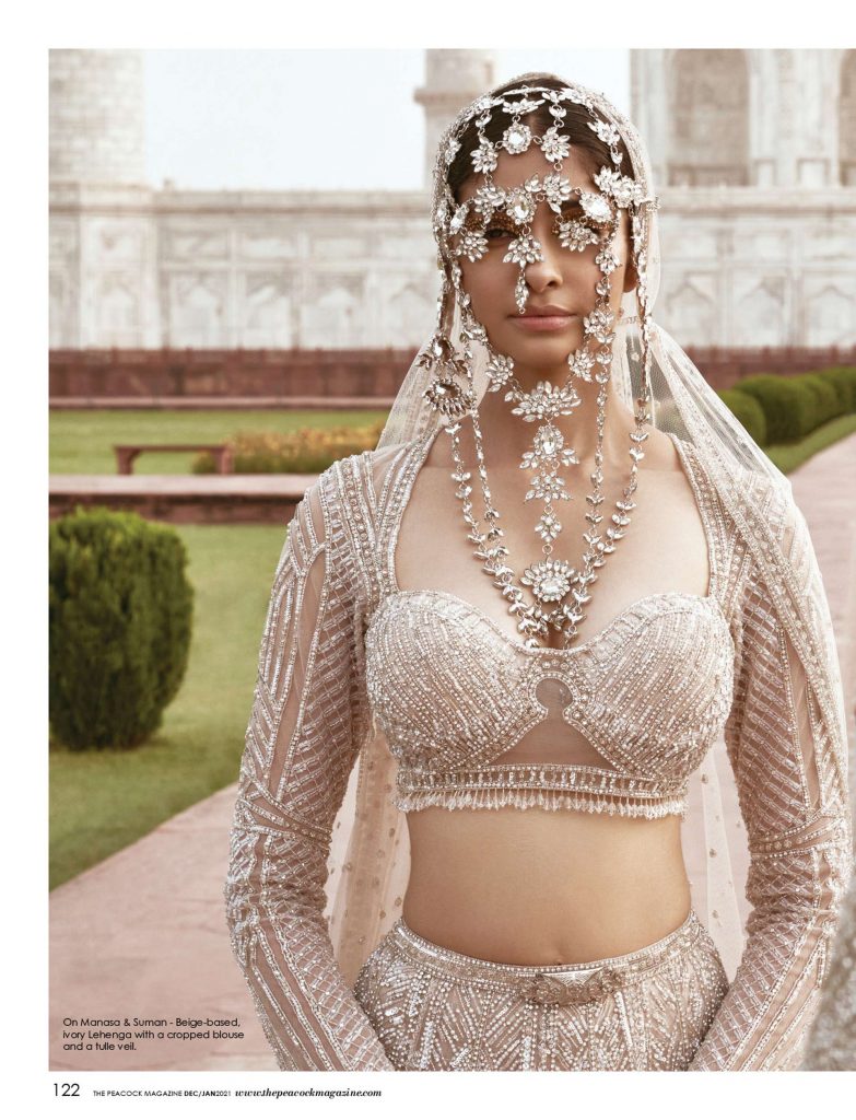 On Manasa – Beige-based, ivory Lehenga with cropped blouse and tulle veil.