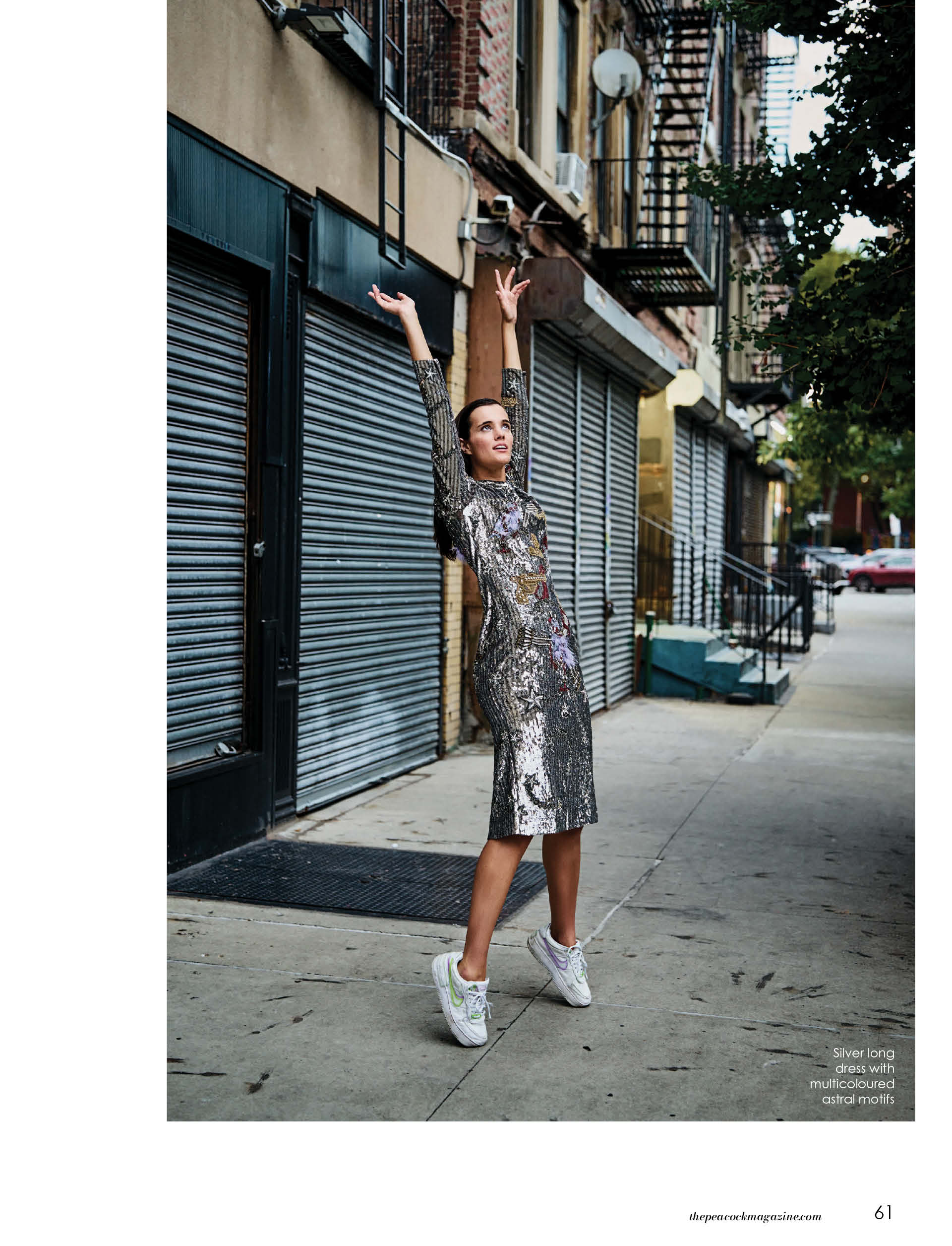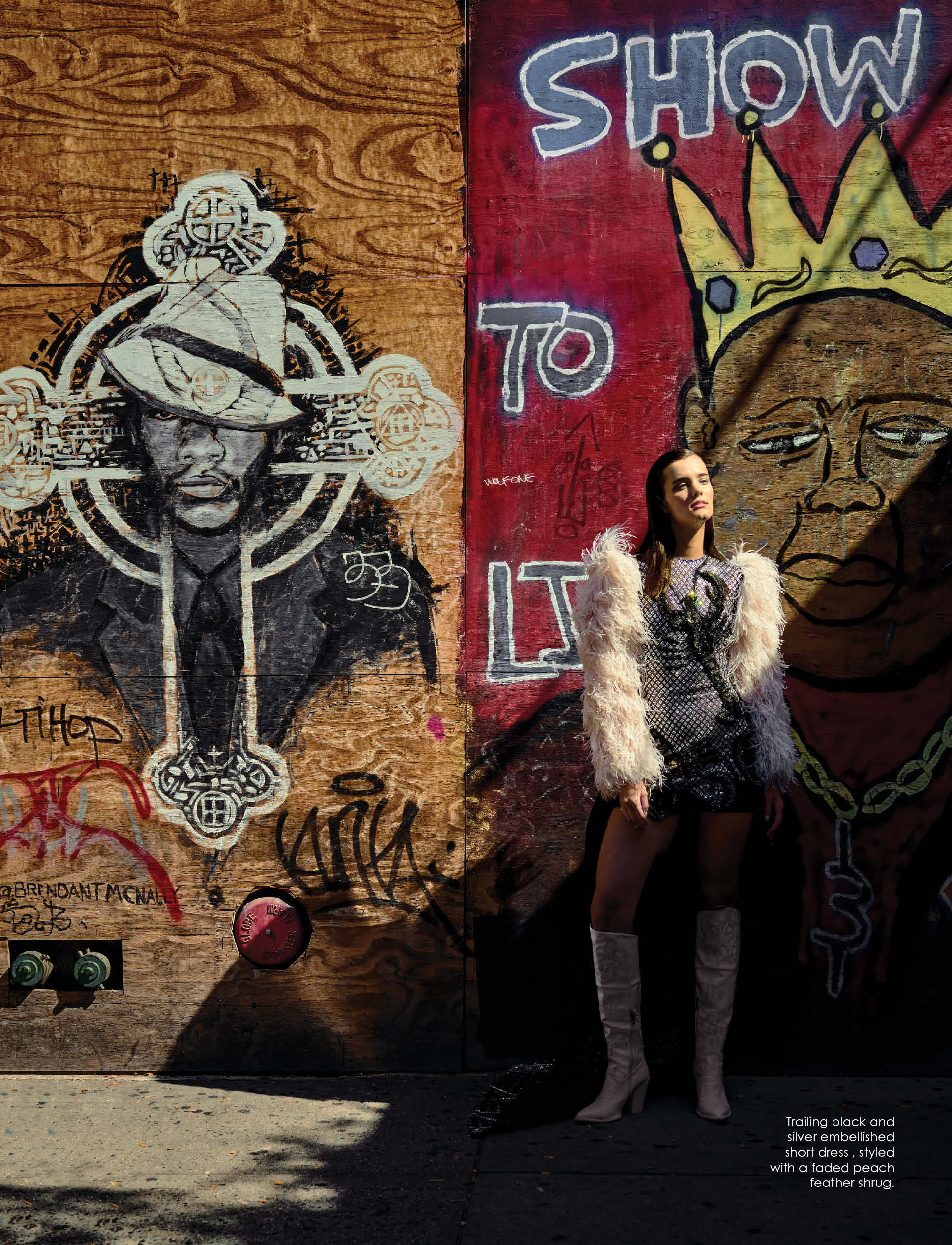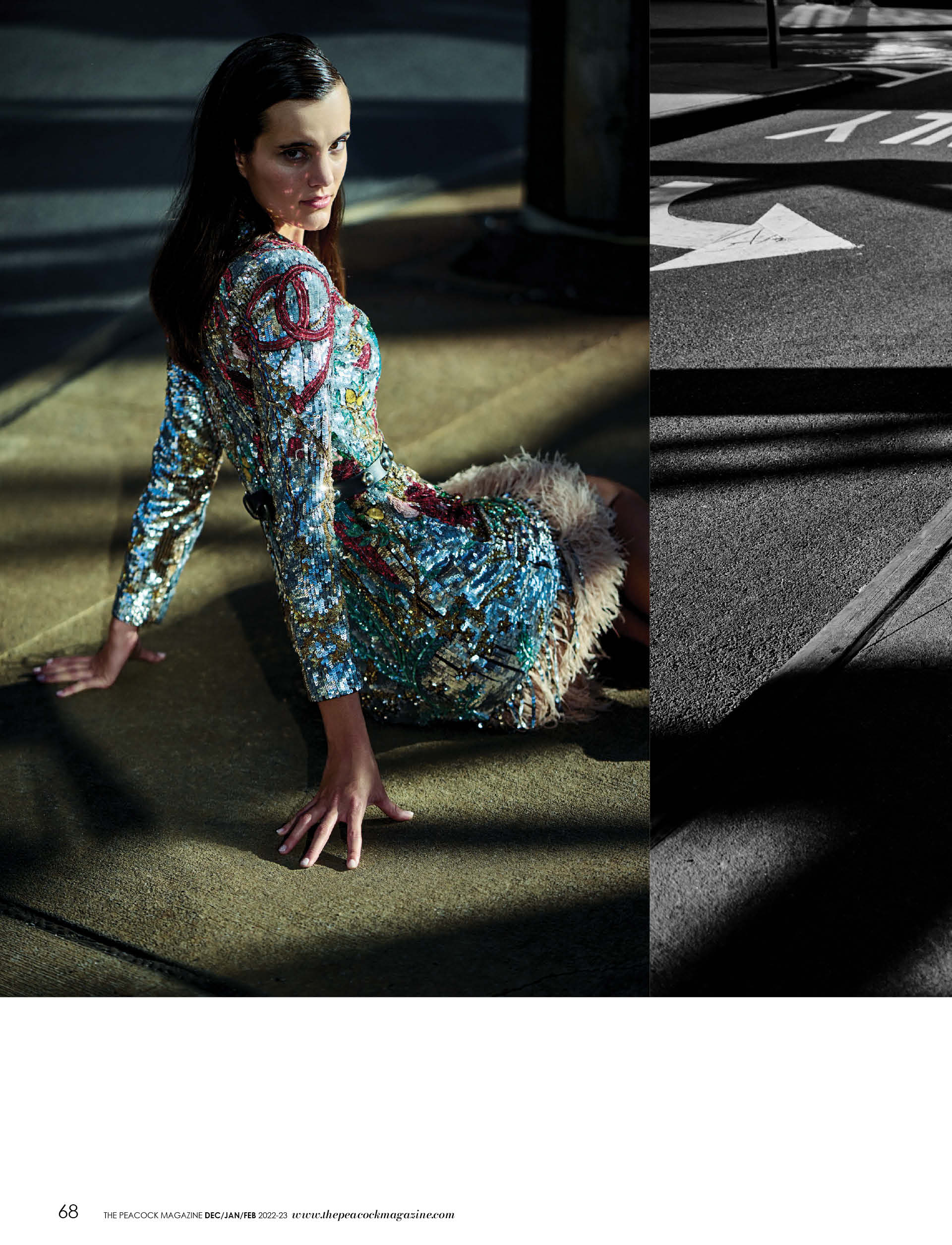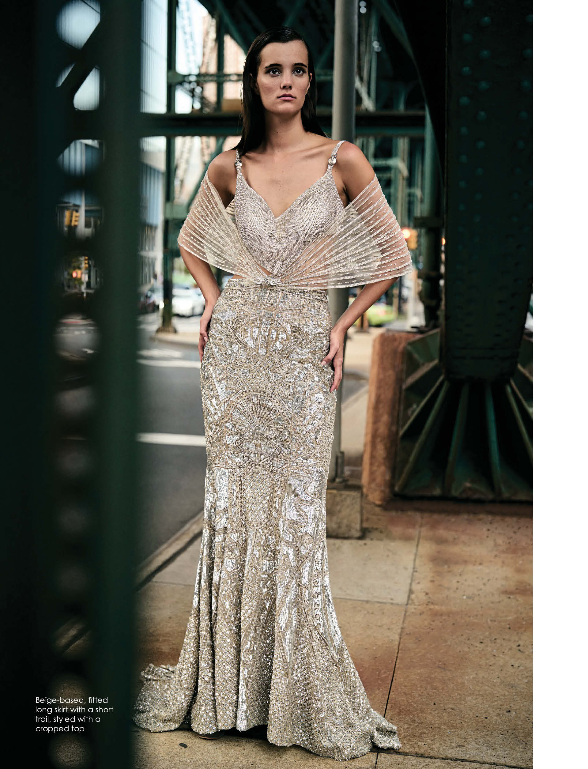 Take to the cultural-chic streets of Harlem and revel in the bling inspired from Falguni Shane Peacock’s ‘Earthbound’ collection that was an ode to the maximal, shiny fashion of the ’80s. Think edgy garbs with power shoulders, rock-chic co-ord sets, unconventionally futuristic short dress-cum-gowns and other highly-stylised silhouettes — making their presence felt in the urbane spaces of Sugar Hill. The embellished fits, which are replete with faceted beads, dome-shaped diamantes, abstract sequins and Swarovski crystals, are a glamorous homage to yesteryear’s fashion. Reimagined gowns, bodycon dresses with risqué cut-outs and feather shrugs are featured in a palette of alluring silver, tough metal, midnight black and royal blue.