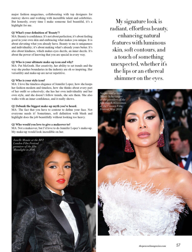 MA: Beauty is confidence. It’s not about perfection; it’s about feeling good in your own skin and embracing what makes you unique. It is about elevating what you already have. Beauty to me is uniqueness and individuality; it’s about making what’s already yours better. It’s also about kindness, which makes eyes dazzle, an inner dazzle. It’s about the power of knowing that you are special in every way.