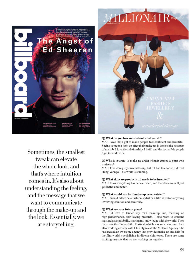 MA: It started with word of mouth. A friend needed make-up for a small photo shoot and I offered to do it. That shoot led to another opportunity, and before I knew it, I was working with photographers and stylists regularly.