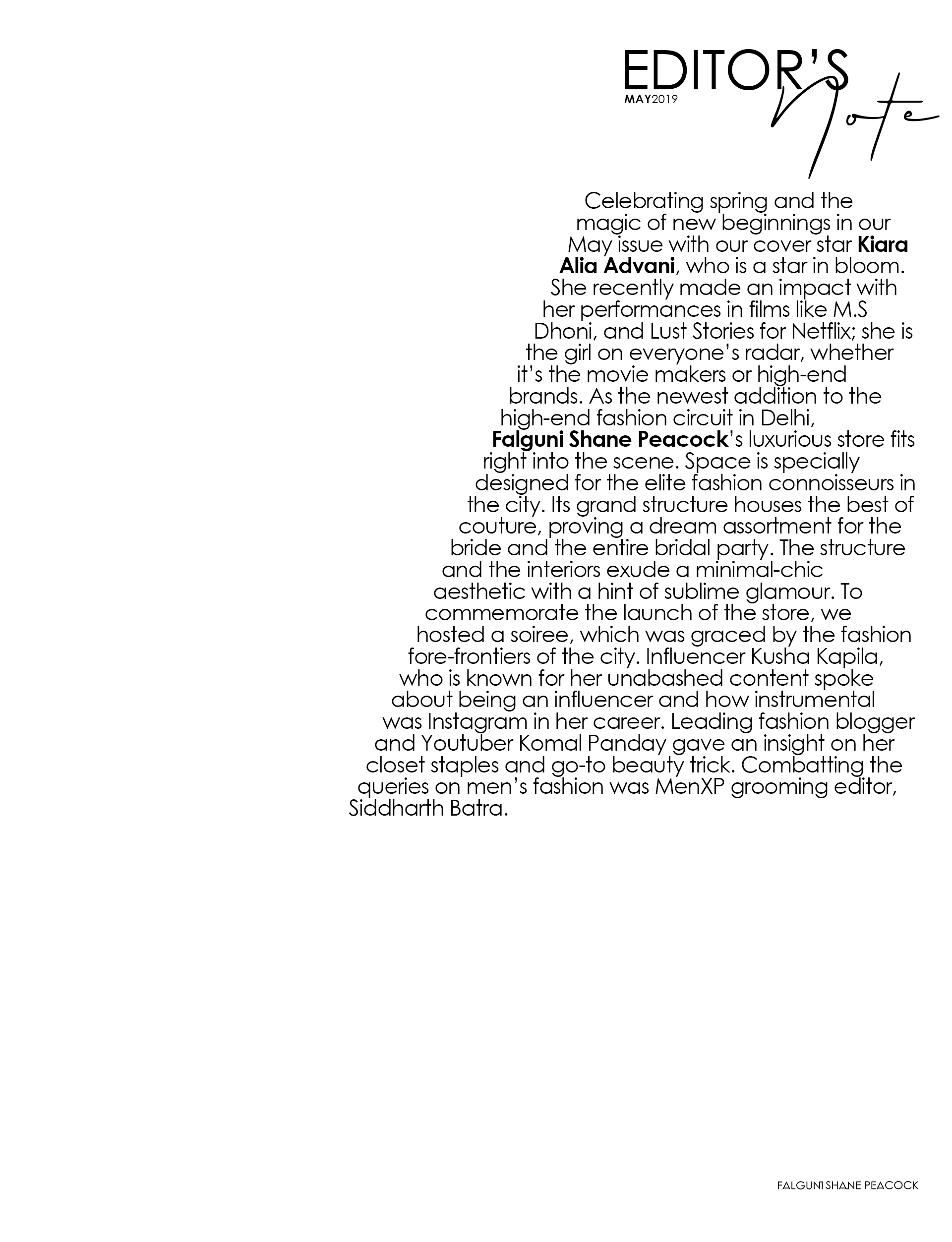 Celebrating spring and the magic of new beginnings in our May issue with our cover star Kiara Alia Advani, who is a star in bloom. She recently made an impact with her performances in films like M.S Dhoni, and Lust Stories for Netflix; she is the girl on everyone’s radar, whether it’s the movie makers or high-end brands. As the newest addition to the high-end fashion circuit in Delhi, Falguni Shane Peacock’s luxurious store fits right into the scene. Space is specially designed for the elite fashion connoisseurs in the city. Its grand structure houses the best of couture, proving a dream assortment for the bride and the entire bridal party. The structure and the interiors exude a minimal-chic aesthetic with ci hint of sublime glamour. To commemorate the launch of the store, we hosted a soiree, which was graced by the fashion fore-frontiers of the city. Influencer Kusha Kapila, who is known for her unabashed content spoke about being an influencer and how instrumental was Instagram in her career. Leading fashion blogger and Youtuber Komal Panday gave an insight on her closet staples and go-to beauty trick. Combatting the queries on men’s fashion was MenXP grooming editor, Siddharth Batra.