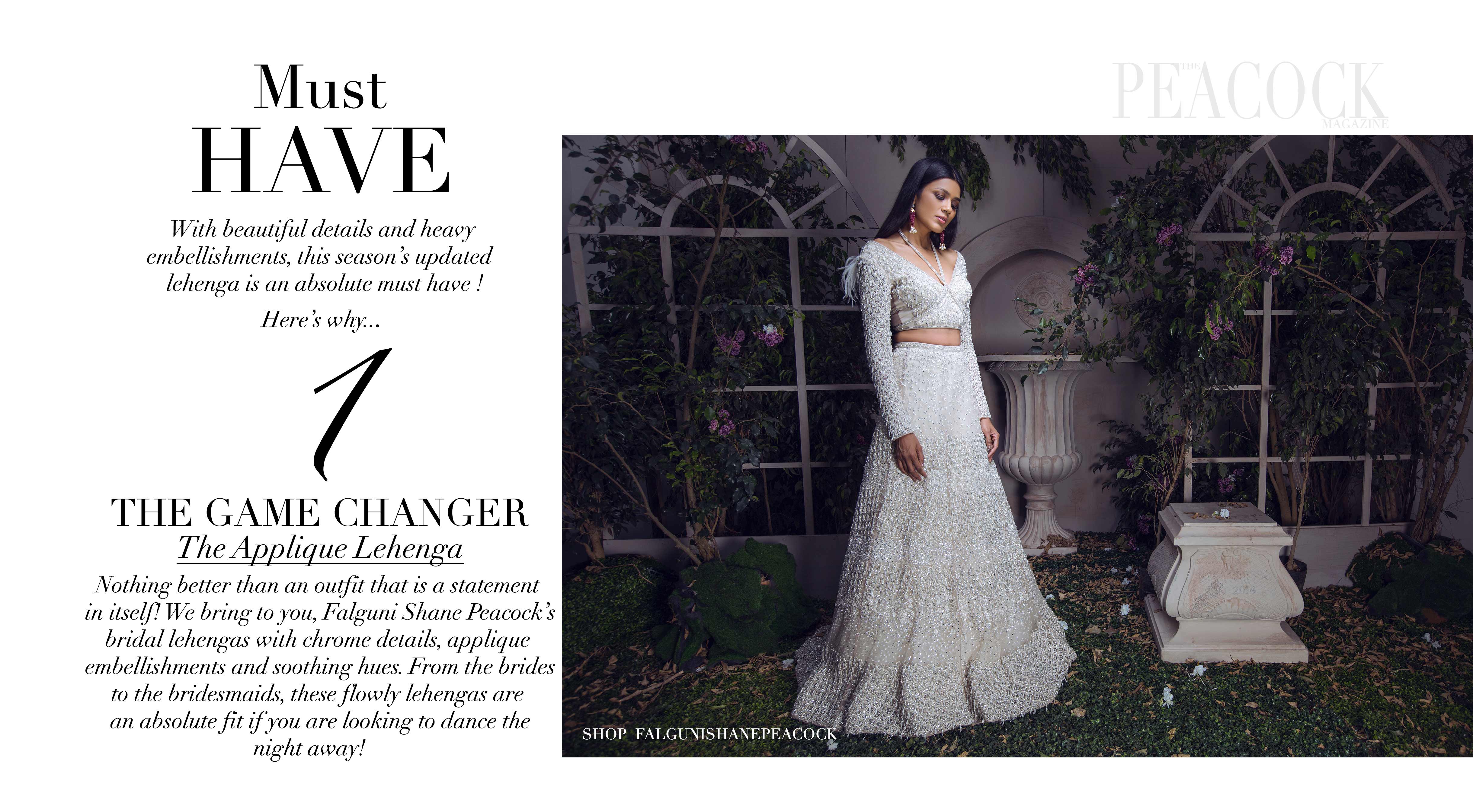 Nothing better than an outfit that is a statement in itself! We bring to you, Falguni Shane Peacock’s bridal lehengas with chrome details, applique embellishments and soothing hues. From the brides to the bridesmaids, these flowly lehengas are an absolute fit if you are looking to dance the night away!