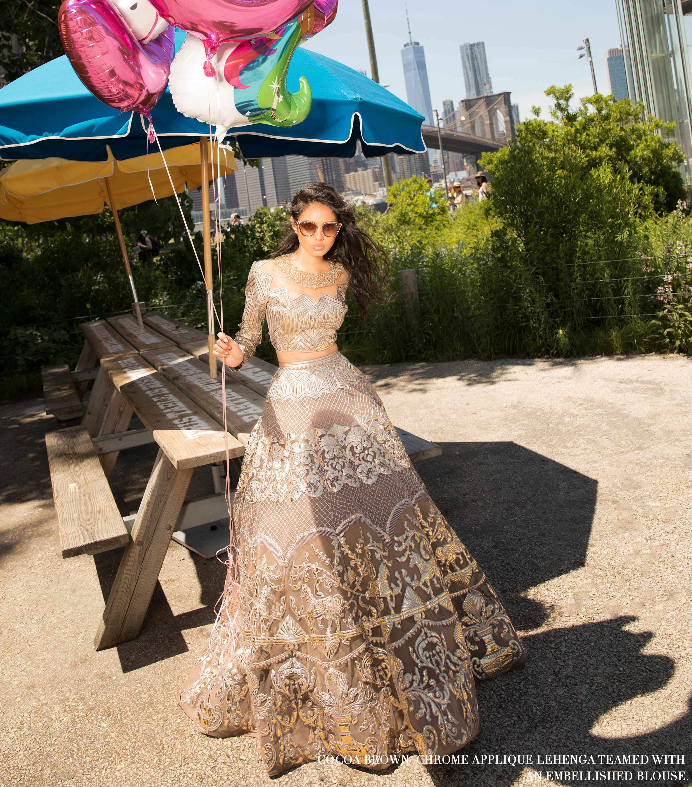 Magnanimous lehenga inscribed with detailed embroidery depicting a traditional Indian ‘mela’ speaks all things festive. The unconventional shade of tinted grey and mauve adds to the mystique of this ingenious silhouette.