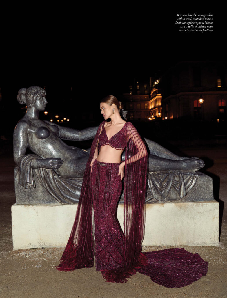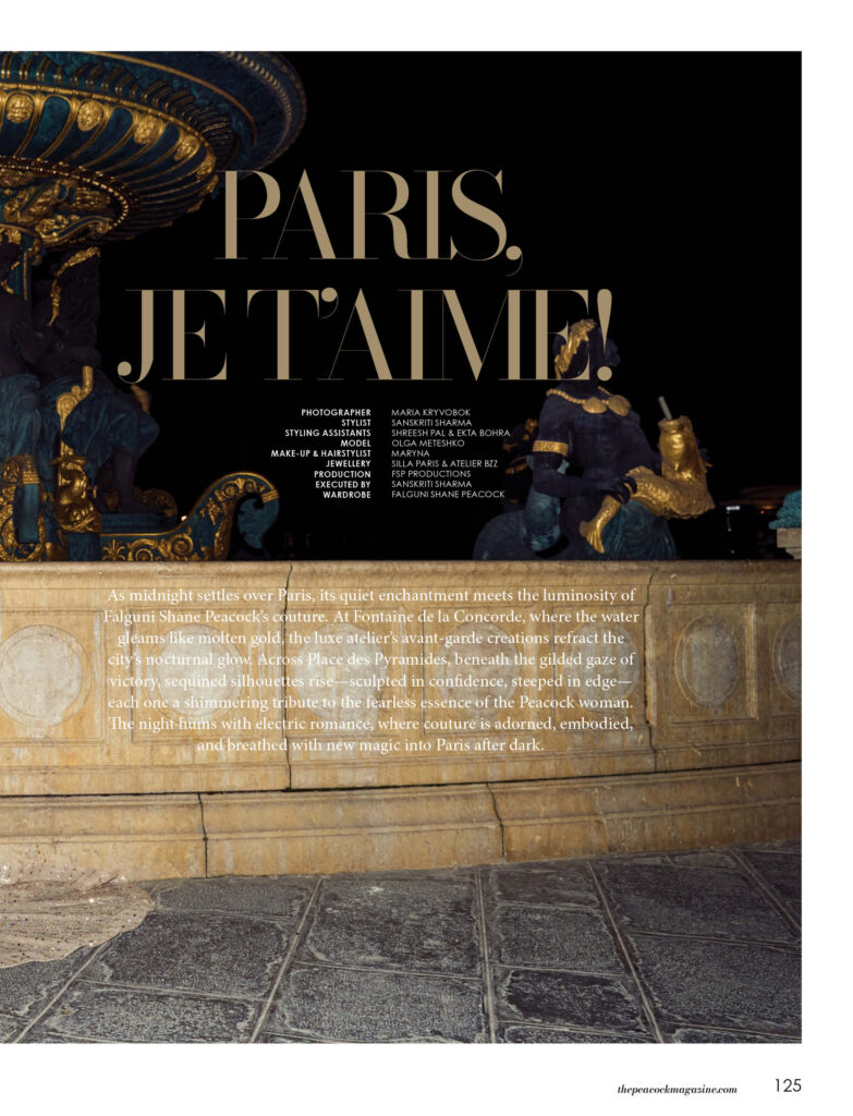 As midnight drapes Paris in its quiet allure, Falguni Shane Peacock’s avant-garde couture lights up the night with an incandescent brilliance. At Fontaine de la Concorde, where water shimmers like liquid gold, their edgy silhouettes cast reflections that ripple with unmatched artistry. But it is at Place des Pyramides, beneath the gaze of gilded triumph, where each ensemble—drenched in sequins, sculpted in audacity and edgy—that stands as a luminous ode to the fearless spirit of a Peacock woman. The midnight air hums with an electric romance, where couture is not merely worn but lived, breathing life into the city’s mysticism.