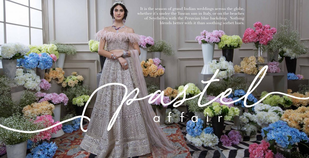 Summer orchestrates as the perfect season for the pastel hues to take the centre stage. It is the season of grand Indian weddings across the globe, whether it’s under the Tuscan sun in Italy, or on the beaches of Seychelles with the Peruvian blue backdrop. Nothing blends better with it than soothing sorbet hues. Gone are the days when brides took the easy route by replicating the good old Bollywood songs IRL. Modern brides are decisive and clear headed about what they want; they bring their A-game when it comes to transcribing their vision into reality. They are verily ready to ditch the stark hues for fresher tones to match the aesthetic of their dream wedding. The array of colours to choose from are limitless, brides incorporate the undertones of nature by inculcating tones of powder blue, mauve, rose-gold, millennial pink, aqua, ivory, grey, mint and pale coral in their ensembles. A coy bride is the story of the past; the modern Indian girls are all about adapting the traditions with a hint of alteration.