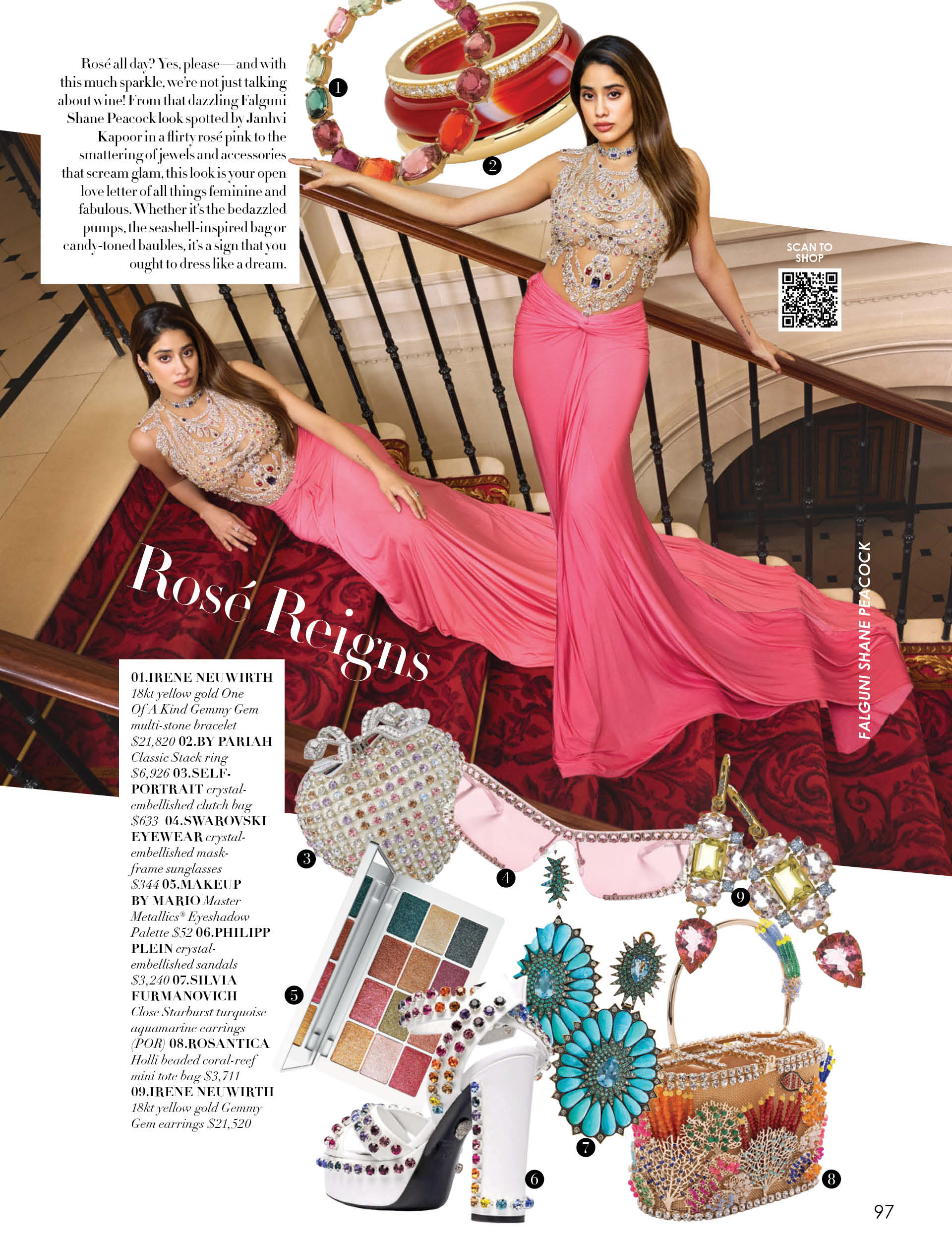 Rosé all day? Yes please—and with this much sparkle, we’re not just talking about wine! From that dazzling Falguni Shane Peacock look spotted by Janhvi Kapoor in a flirty rosé pink to the smattering of jewels and accessories that scream glam, this look is a love letter to all things feminine and fabulous. Whether it’s the bedazzled pumps, the seashell-inspired bag or candy-toned baubles, it’s a sign that you ought to dress like a dream.