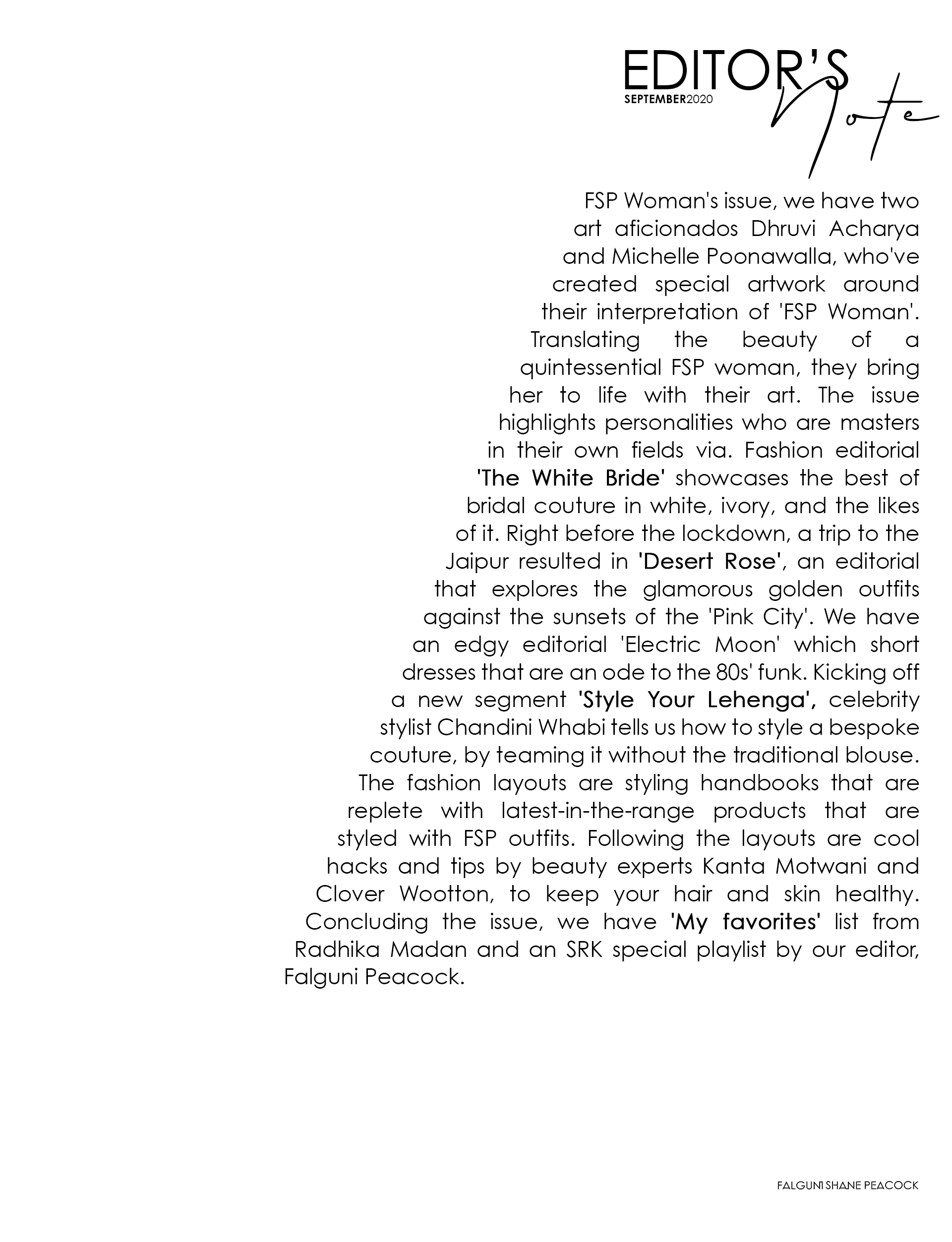 FSP Woman’s issue, we have two art aficionados Dhruvi Acharya and Michelle Poonawalla, who’ve created special artwork around their interpretation of ‘FSP Woman’. Translating the beauty of a quintessential FSP woman, they bring her to life with their art. The issue highlights personalities who are masters in their own fields via. Fashion editorial ‘The White Bride‘ showcases the best of bridal couture in white, ivory, and the likes of it. Right before the lockdown, a trip to the Jaipur resulted in ‘Desert Rose‘, an editorial that explores the glamorous golden outfits against the sunsets of the ‘Pink City’. We have an edgy editorial ‘Electric Moon’ which short dresses that are an ode to the 80s’ funk. Kicking off a new segment ‘Style Your Lehenga’, celebrity stylist Chandini Whabi tells us how to style a bespoke couture, by teaming it without the traditional blouse. The fashion layouts are styling handbooks that are replete with latest-in-the-range products that are styled with FSP outfits. Following the layouts are cool hacks and tips by beauty experts Kanta Motwani and Clover Wootton, to keep your hair and skin healthy. Concluding the issue, we have ‘My favorites’ list from Radhika Madan and an SRK special playlist by our editor, Falguni Peacock.