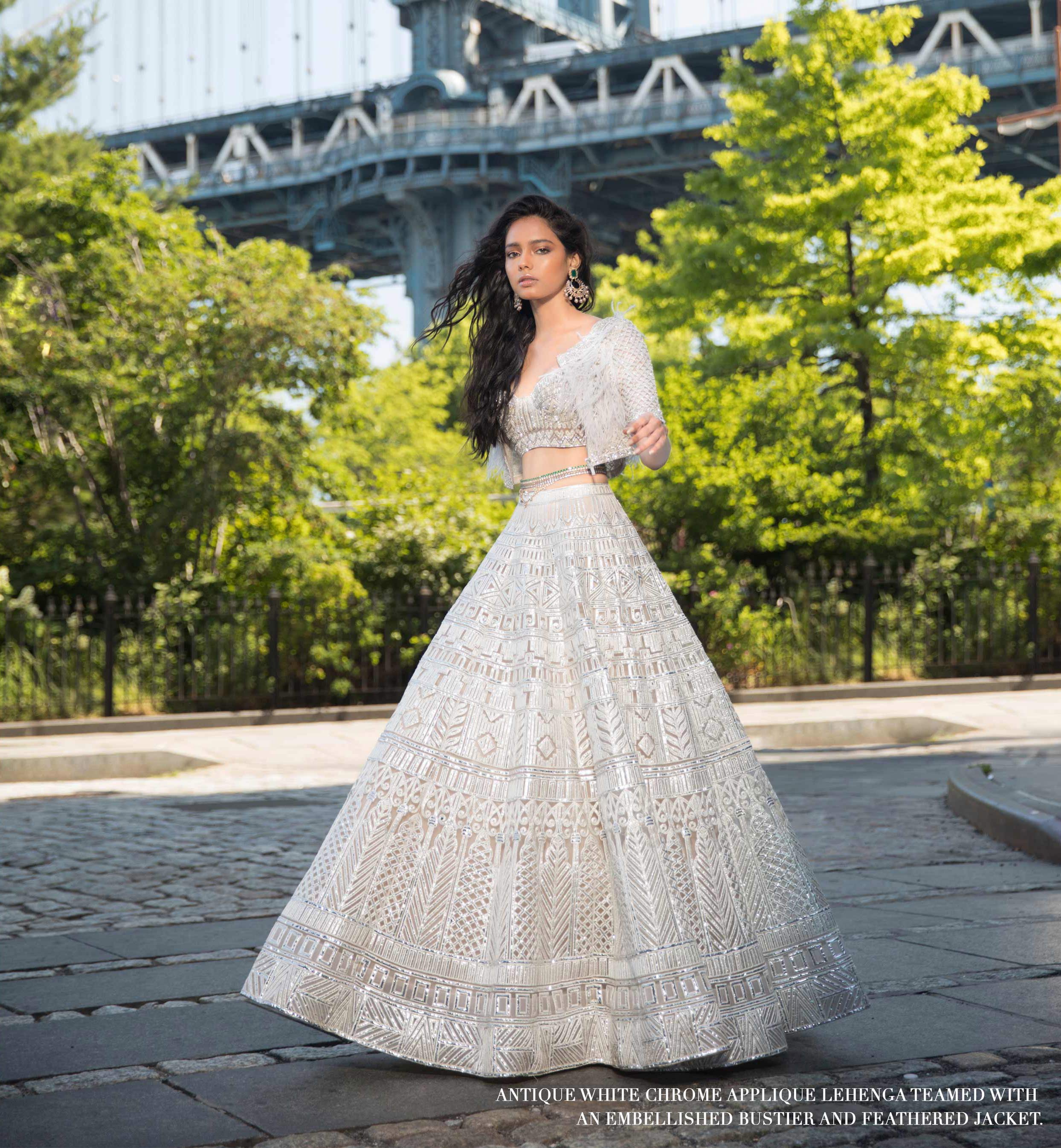 Crowned as one of the fashion capitals of the world, New York City befits the title like no other. A city that is a boiling pot of art, culture, fashion and history has inspiration in every look. Being the central capital of fashion, the city doesn’t have a bad frame in sight. From the bustling streets and the energy it contains, its real beauty lies in its magnanimity. Haute couture complementing the fashion haven was the idea behind conceiving the resplendent editorial. Voluminous lehengas look captivating against the metropolitan jungle – making it the perfect mélange. The exaggerated glamour reflecting through the over-sized glasses, shoulder dangling dusters and signature feathers across the iconic Brooklyn Bridge paid the perfect homage to the bedazzling city.