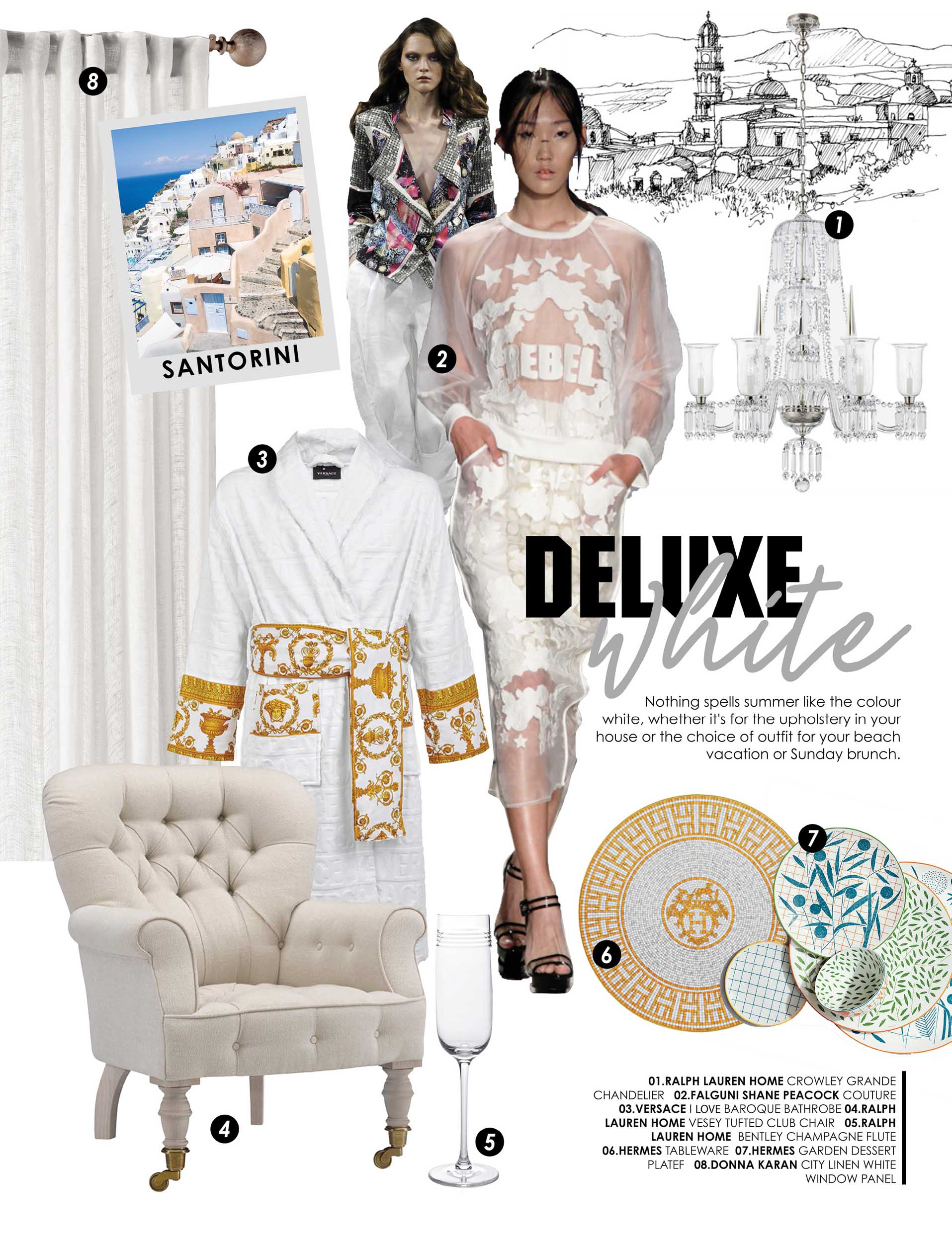 DELUXE WHITE RALPH LAURAN HOME CROWLEY GRANDE CHANDELIER FALGUNI SHANE PEACOCK COUTURE VERSACE I LOVE BAROQUE BATHROBE EAR CUFF RALPH LAURAN HOME VESEY TUFTED CLUB CHAIR RALPH LAURAN HOME BENTLEY CHAMPAGNE FLUTE THOMAS SABO CHARM PENDANT HERMES GARDEN DESSERT PLATEF DONNA KARAN CITY LINEN WHITE WINDOW PANEL Nothing spells summer like the colour white, whether it’s for the upholstery in your house or the choice of outfit for your beach vacation or Sunday brunch. GO TO ISSUE
