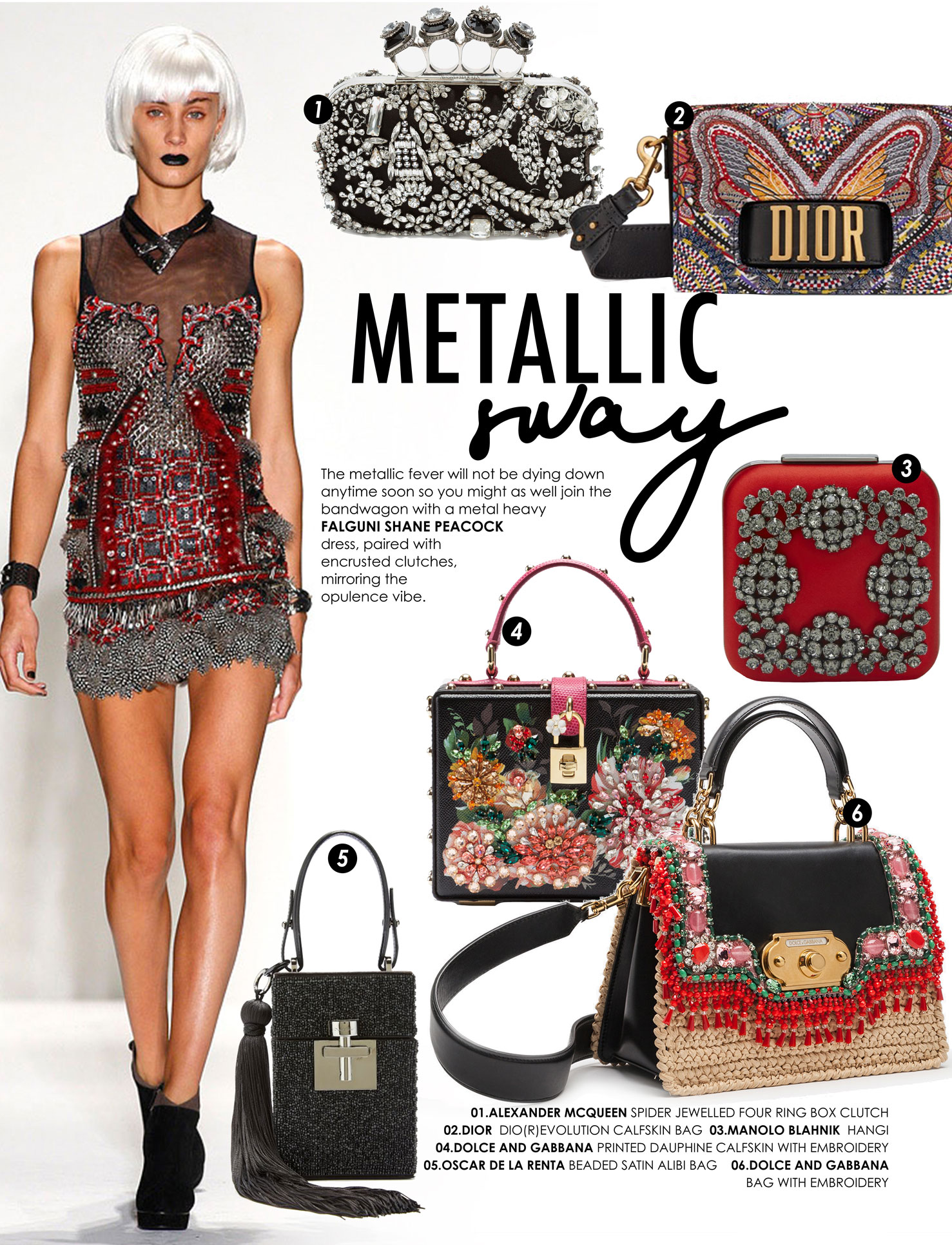 The metallic fever will not be dying down anytime soon so you might as well join the bandwagon with a metal heavy FALGUNI SHANE PEACOCK dress, paired with encrusted clutches, mirroring the opulence vibe.