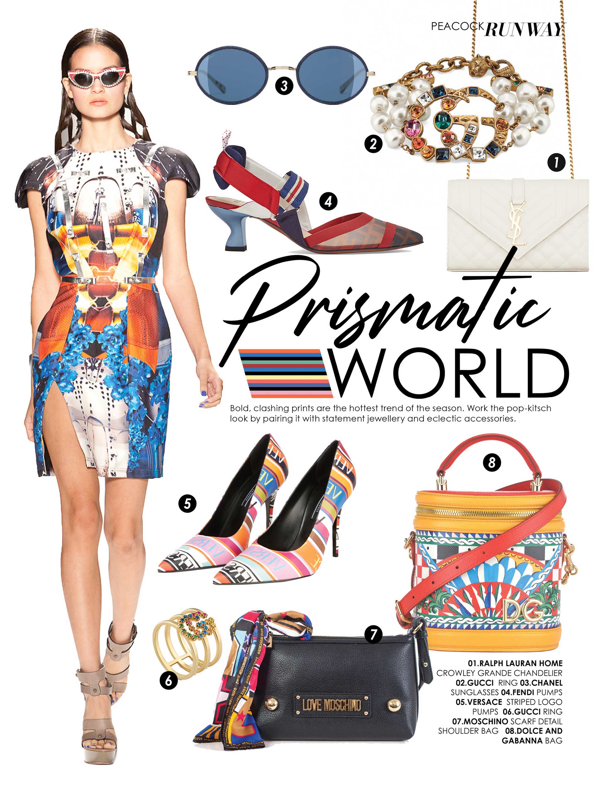 PRISMATIC WORLD RALPH LAURAN HOME CROWLEY GRANDE CHANDELIER GUCCI RING CHANEL SUNGLASSES BATHROBE EAR CUFF FENDI PUMPS VERSACE STRIPED LOGO PUMPS GUCCI RING MOSCHINO SCARF DETAIL SHOULDER BAG DOLCE AND GABANNA BAG PRISMATIC WORLD Bold, clashing prints are the hottest trend of the season. Work the pop-kitsch look by pairing it with statement jewellery and eclectic accessories. GO TO ISSUE