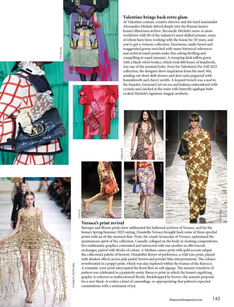 At Valentino couture, creative director and die-hard maximalist Alessandro Michele delved deeply into the Roman luxury house’s illustrious archive. Reconcile Michele’s more-is-more worldview with 80 of the industry’s most skilled artisans, some of whom have been working with the house for 50 years, and you’ve got a virtuoso collection. Enormous, multi-tiered and exaggerated gowns enriched with many historical references and archival touch points make this outing thrilling and compelling in equal measure. A sweeping dark taffeta gown with a black velvet bodice, which took 860 hours of handwork, was one of the seminal looks. Even for Valentino’s Pre-Fall 2025 collection, the designer drew inspiration from the mod ’60s, sending out short shift dresses and skirt suits peppered with houndstooth and cherry motifs. A leopard trench was a nod to the founder, Garavani’s jet set era and kaftans embroidered with crystals and cinched at the waist with butterfly applique belts evoked Michele’s signature magpie aesthetic.