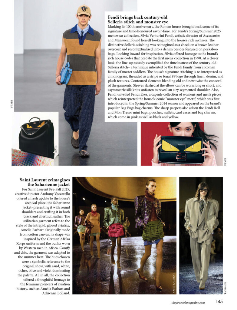 Marking its 100th anniversary, the Roman house brought back some of its signature and time-honoured savoir-faire. For Fendi’s Spring/Summer 2025 menswear collection, Silvia Venturini Fendi, artistic director of Accessories and Menswear, found herself looking into the house’s rich archives. The distinctive Selleria stitching was reimagined as a check on a brown leather overcoat and recontextualised into a denim besides featured on peekaboo bags. Looking inward for inspiration, Silvia offered homage to the brand’s rich house codes that predate the first men’s collection in 1990. At a closer look, the line-up astutely exemplified the timelessness of the century-old Selleria stitch– a technique inherited by the Fendi family from a Roman family of master saddlers. The house’s signature stitching is re-interpreted as a monogram, threaded as a stripe or tonal FF logo through linen, denim, and plush textures. Contoured elements blending old and new twist the concord of the garments. Sleeves slashed at the elbow can be worn long or short, and asymmetric silk knits unfasten to reveal an airy segmented shoulder. Also, Fendi unveiled Fendi Eyes, a capsule collection of women’s and men’s pieces which reinterpreted the house’s iconic “monster eye” motif, which was first introduced in the Spring/Summer 2014 season and appeared on the brand’s popular Bag Bugs bag charms. The sharp peepers also adorn the Fendi Roll and Mon Tresor mini bags, pouches, wallets, card cases and bag charms, which come in pink as well as black and yellow.
